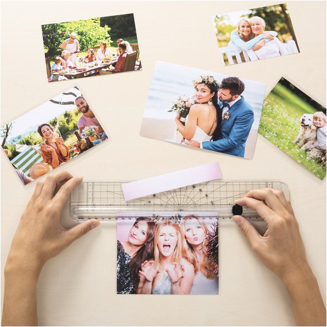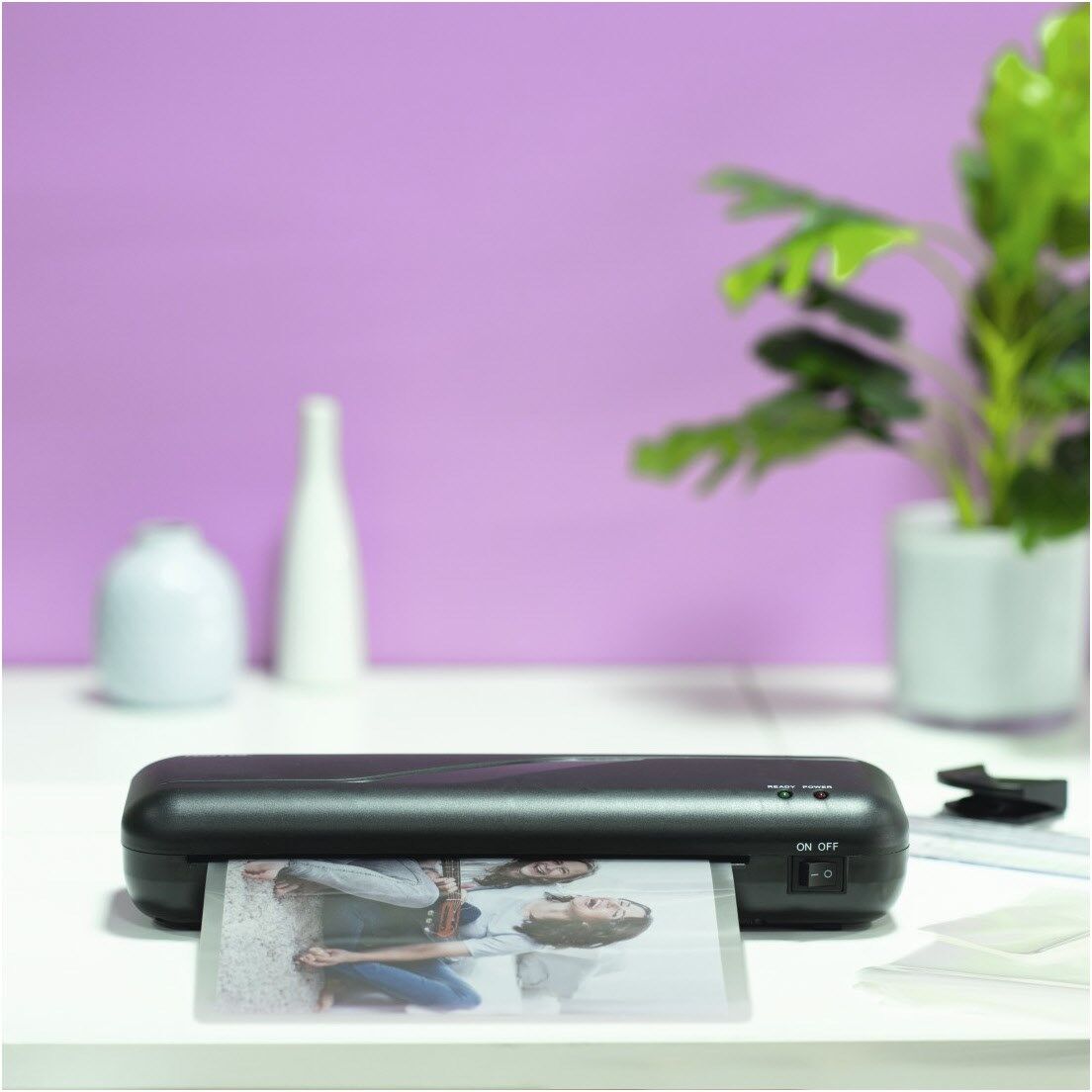 Inklusive Schneidlineal, mit dem sich Papier sowie Laminierfolien einfach zuschneiden lassen