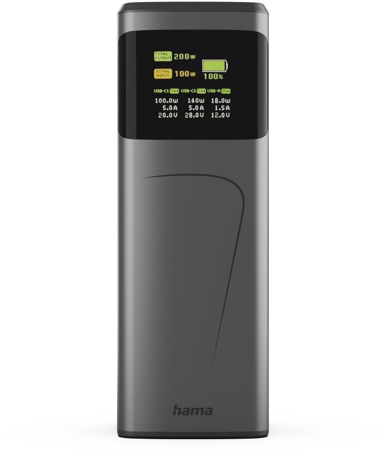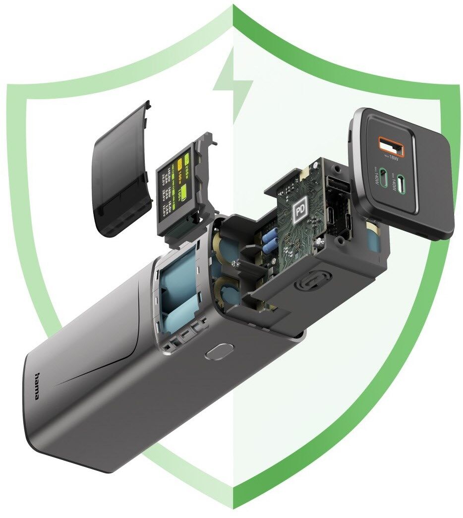 Powerbank sorgt für den Energieschub unterwegs; das mobile Ladegerät kann an zwei USB-C-Buchsen und einer USB-A-Buchse drei Geräte gleichzeitig laden