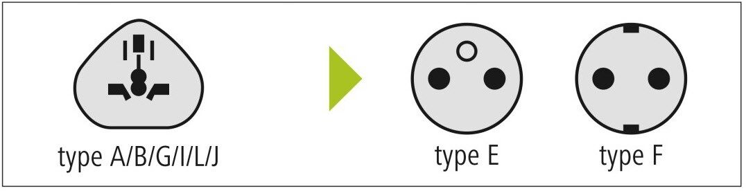 Ermöglicht den Anschluss von Elektrogeräten mit abweichenden Steckertypen in Ländern mit deutschem und französischem Steckdosensystemen