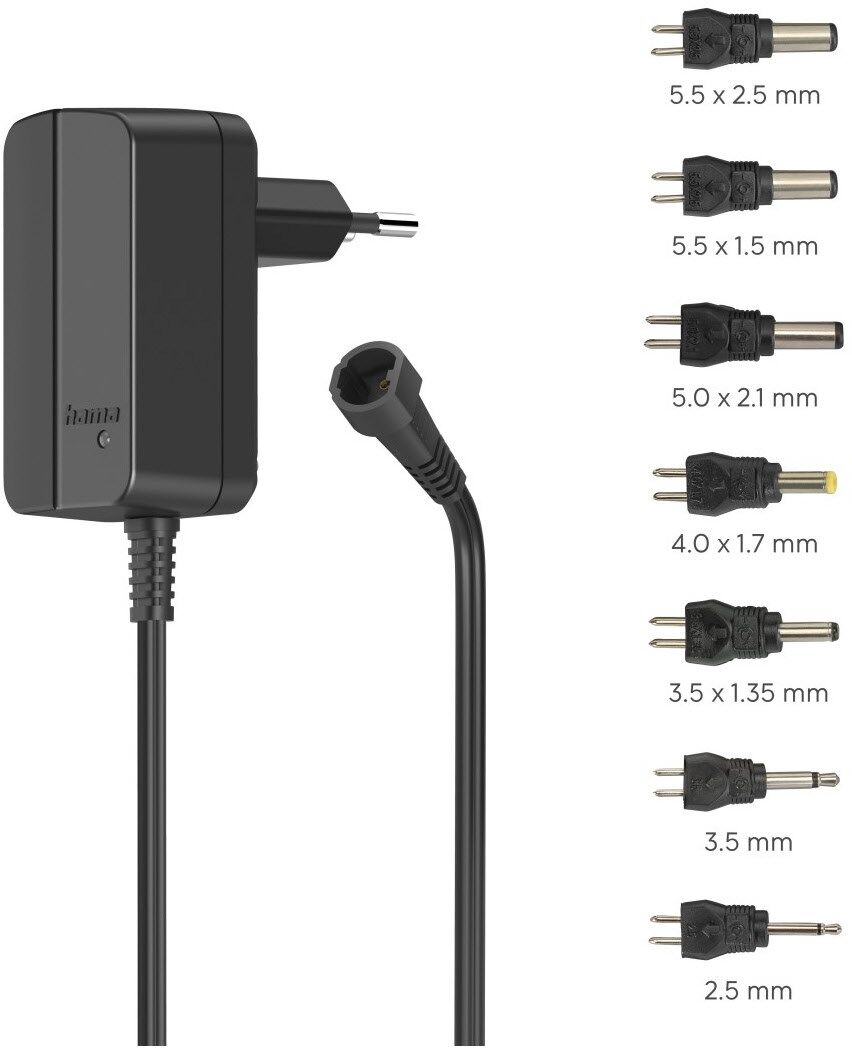 Mit 7 Adapersteckern: 2 Klinkenstecker: 2,5 und 3,5 mm, 5 DC-Stecker: 1,35 x 3,5 / 1,7 x 4,0 / 2,1 x 5,0 / 1,5 x 5,5 / 2,5 x 5,5 mm