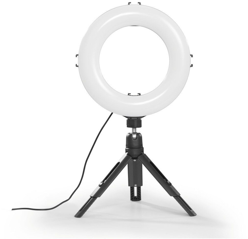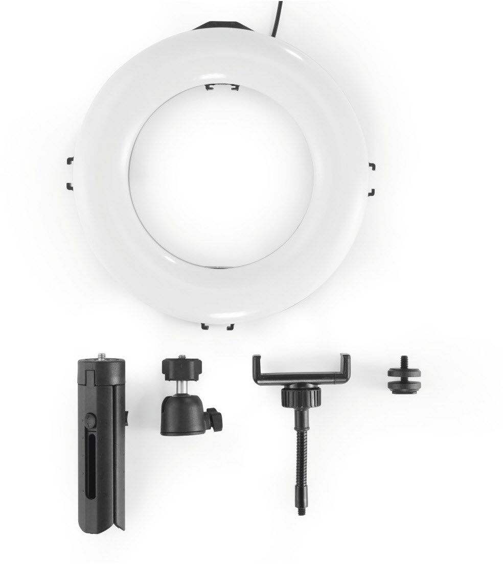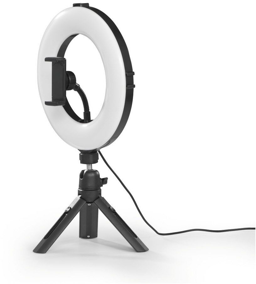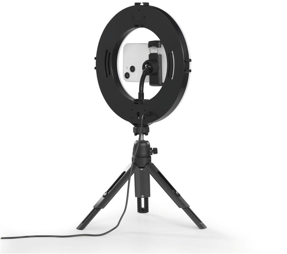 LED-Ringleuchte: Ringleuchte mit 8" (Außendurchmesser 21 cm) und 96 LEDs mit Kabelfernbedienung, Stromversorgung über USB-A-Kabel (Kabellänge 190 cm) zum Anschluss z.B. an einen Power Pack Schwanenhals mit Handyhalterung