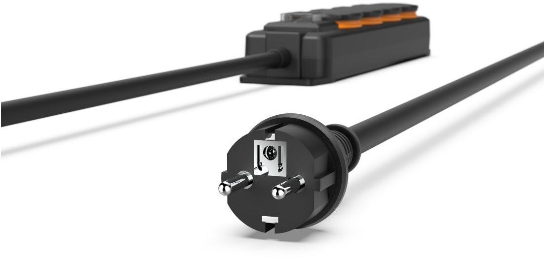Zugentlastung undKnickschutz am Stecker und an der Steckdosenleiste schützen vor Kabelbruch