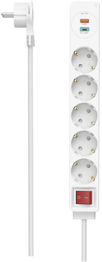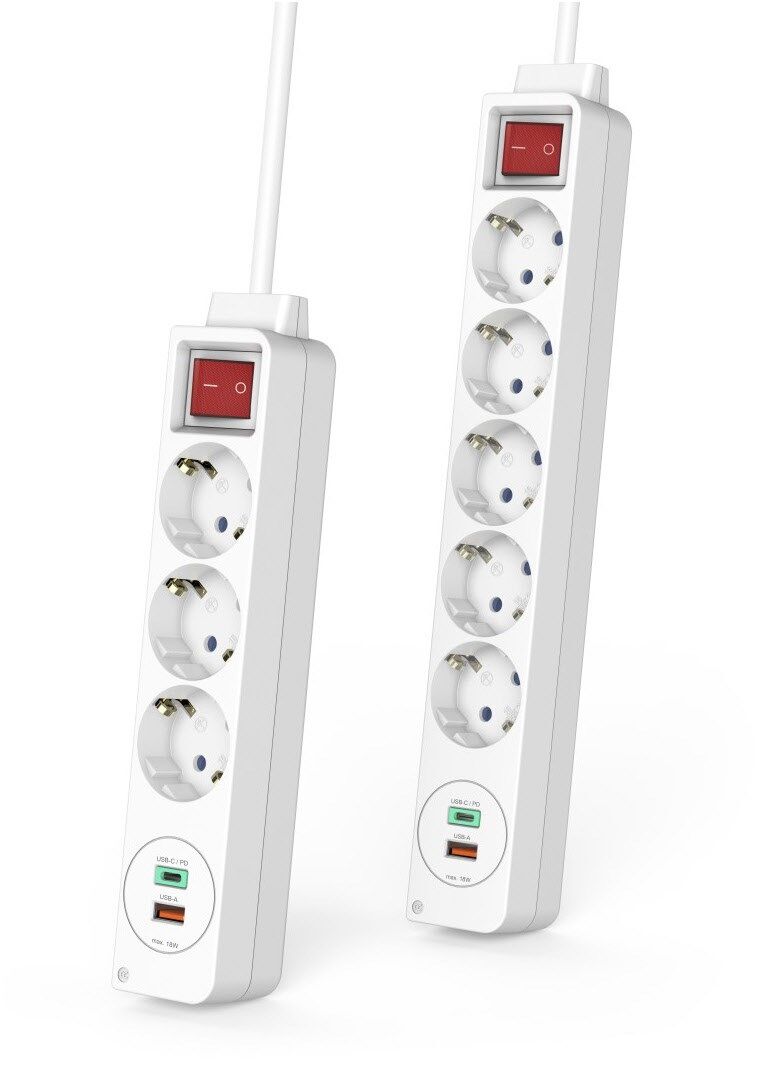 Mehrfachsteckdose zum Anschluss von bis zu sieben elektrischen Geräten über fünf Schutzkontakt-Steckdosen und zwei USB-Ausgänge