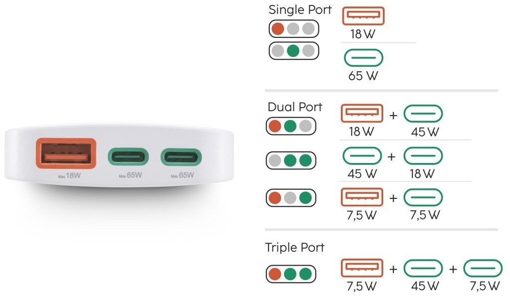 Mit 1x USB-A-Buchse und 2x USB-C-Buchse: ideal für alle Geräte, welche über USB geladen und betrieben werden, z.B. Tablet, Smartphone, Power Pack und Konsole - dank hoher Leistung auch Laptop und Notebook