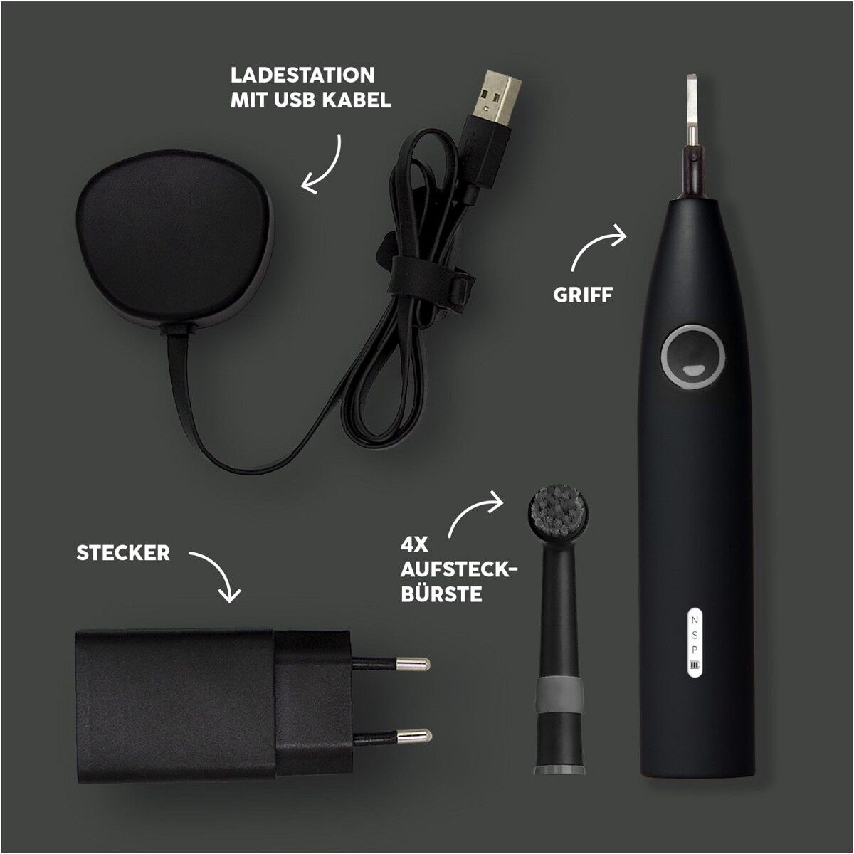 Inhalt: 1x Elektrische Zahnbürste Eco R2 AllBlack, 1x magnetisches Ladegerät + USB-Kabel,1x Stecker, 4x Aufsteckbürsten, Plastikfreie Umverpackungen aus FSC-zertifiziertem Karton.