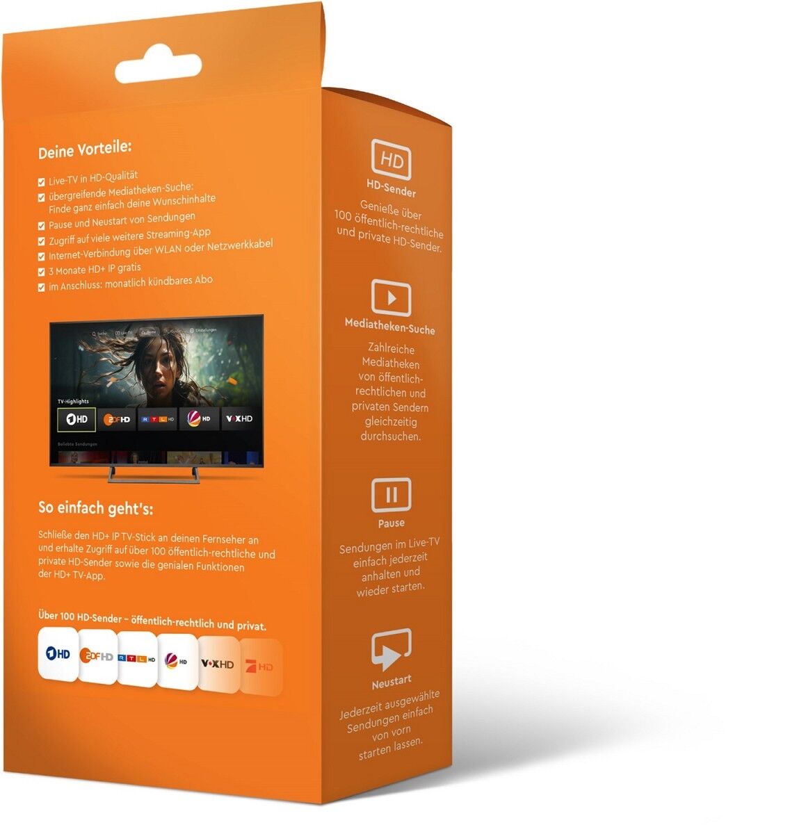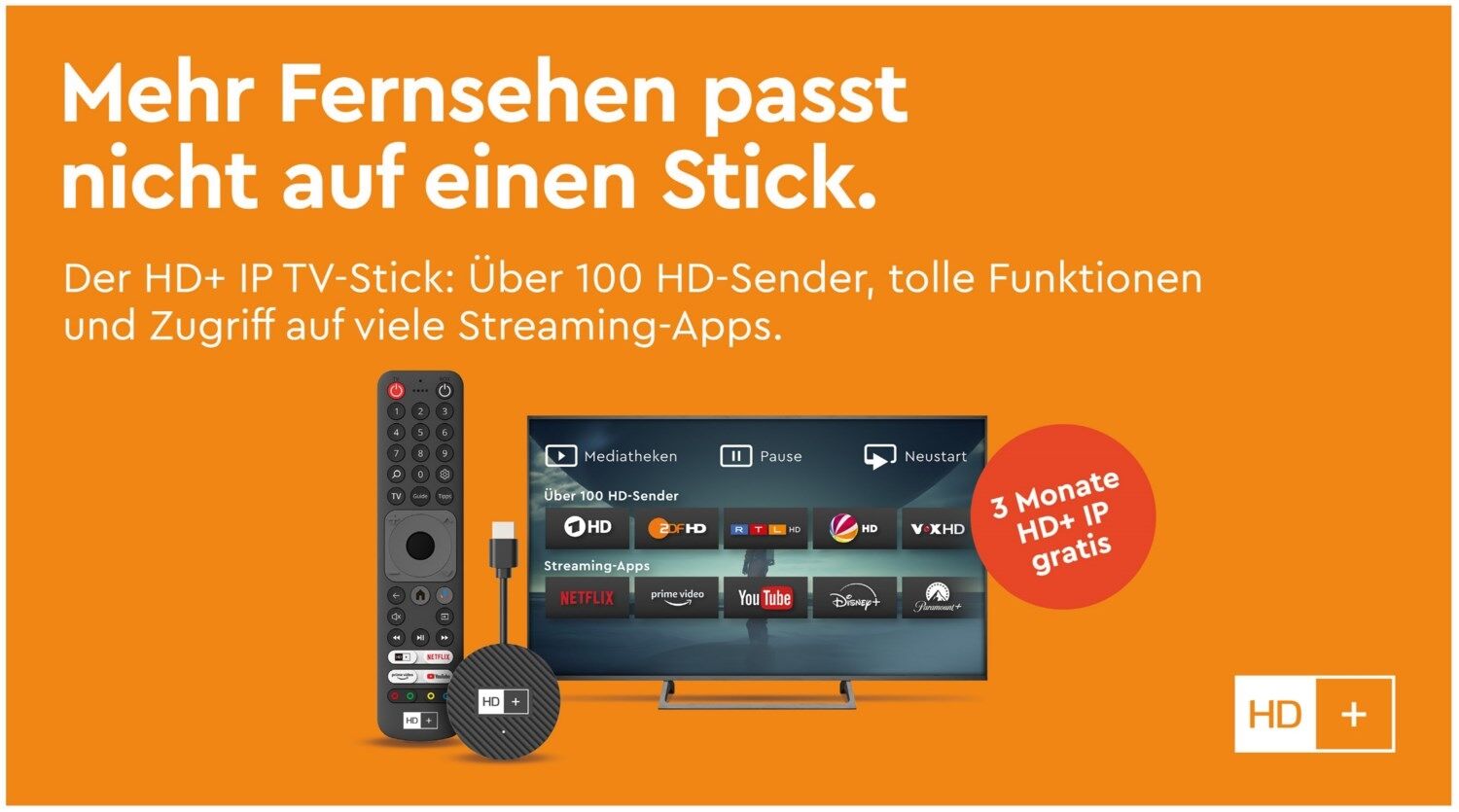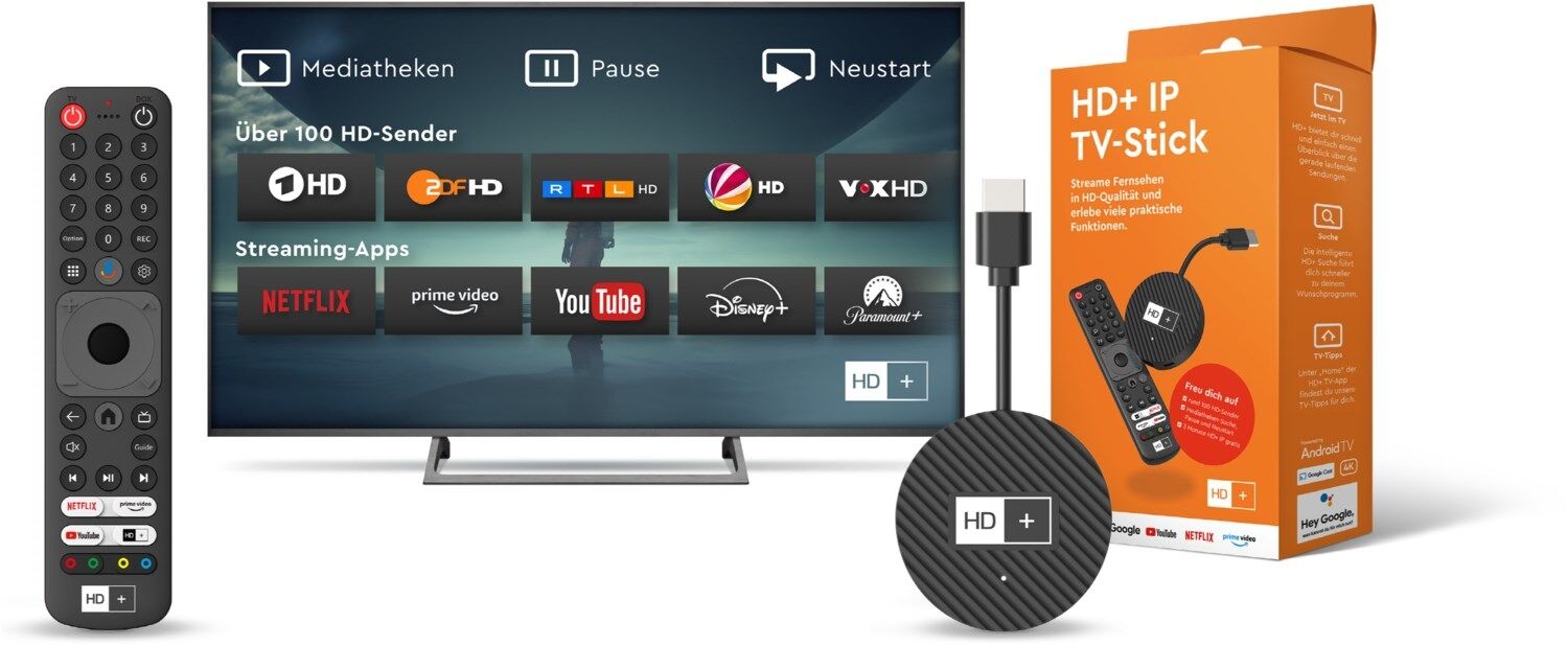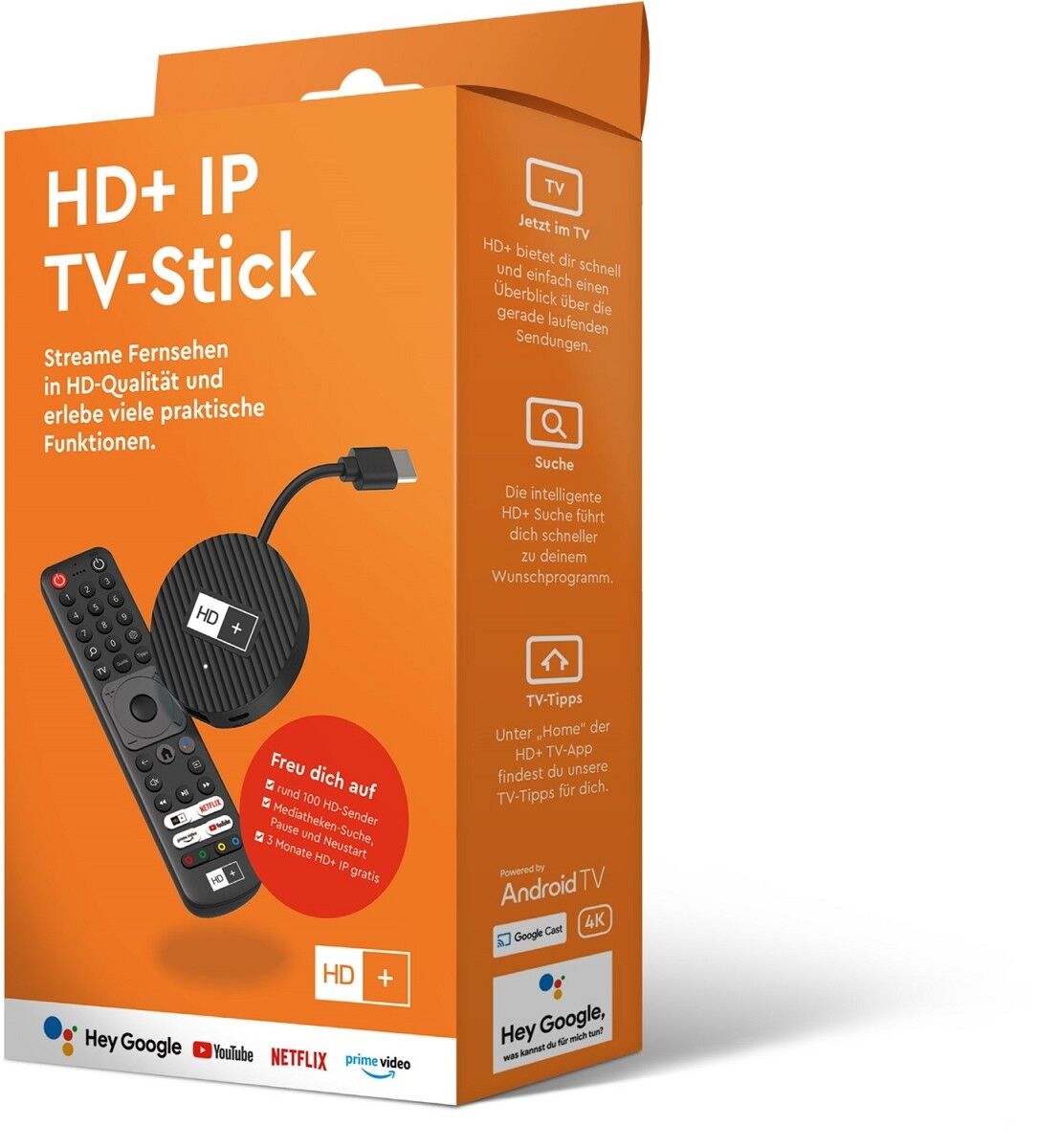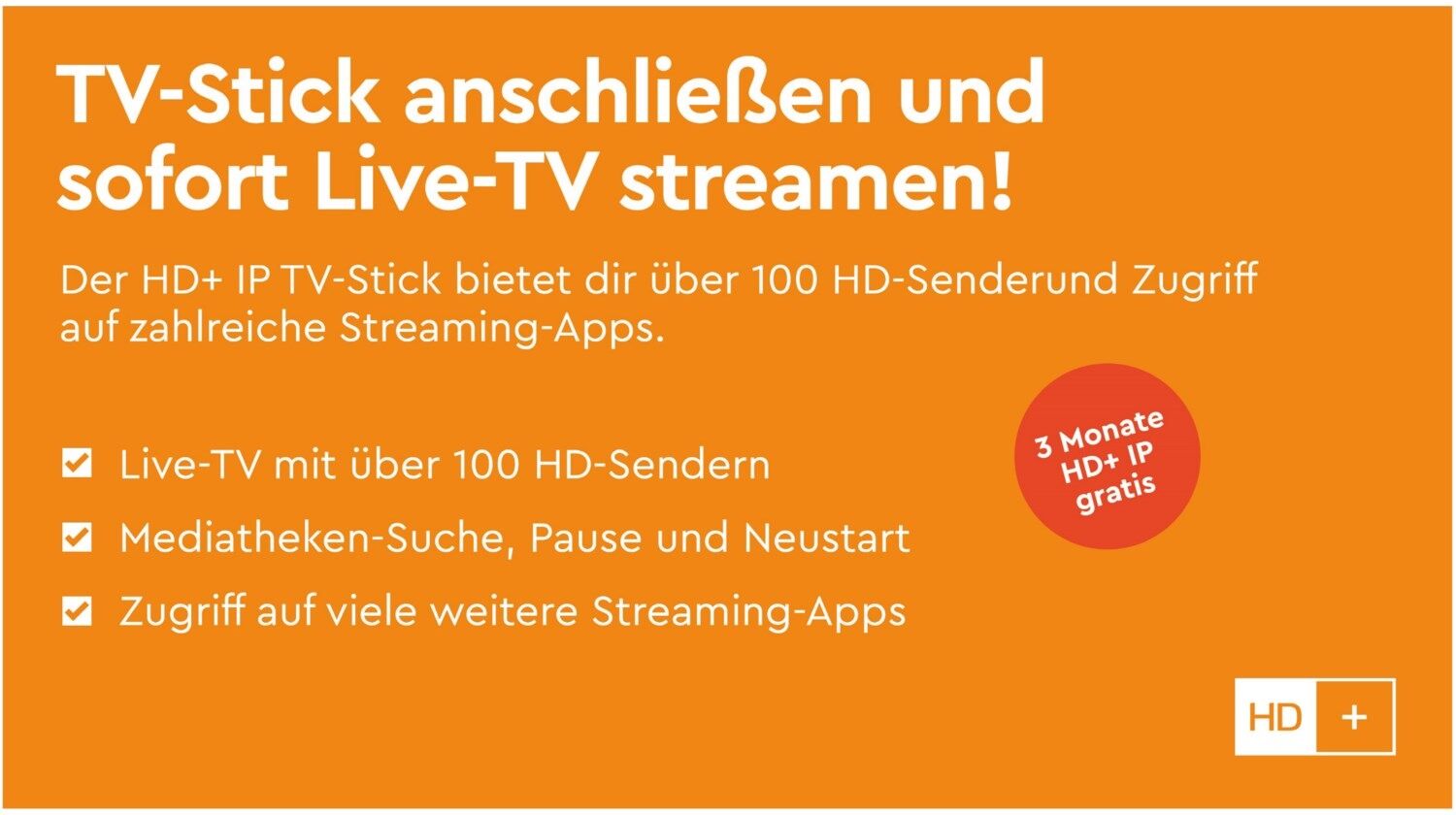 Du suchst nach einer schnellen und einfachen Alternative zum Kabel- oder Antennen-Empfang mit Live-TV in HD-Qualität? Dann ist der HD+ IP TV-Stick das Richtige für dich. Einfach den TV-Stick an deinen Fernseher anschließen – schon genießt du über 100 HD-Sender. Entdecke außerdem tolle TV-Funktionen und den Zugriff auf deine Streaming-Apps!