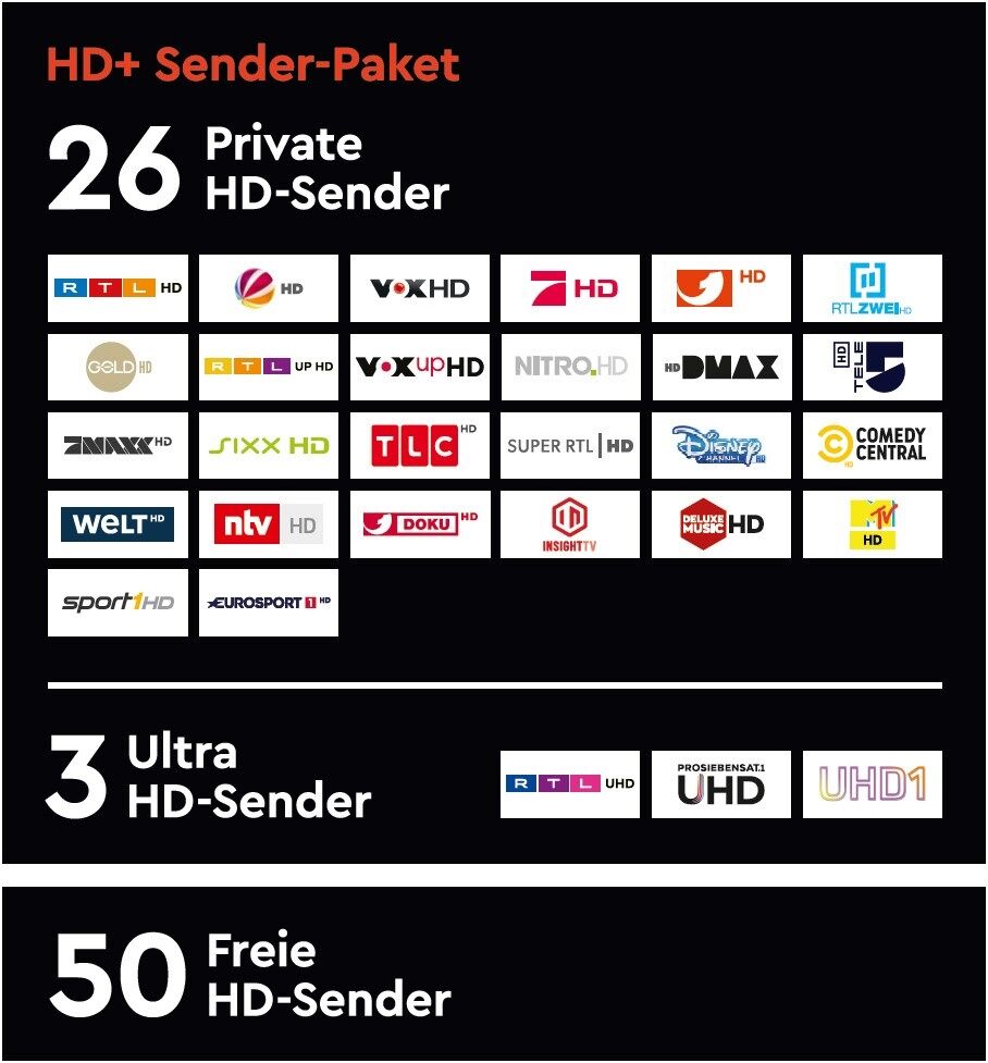 26 private HD- und 3 UHD-Sender sowie 70 frei empfangbare HD-Sender