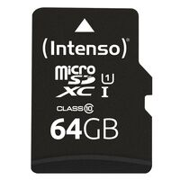 Intenso 3424490. Kapazität: 64 GB, Flash Card Typ: MicroSD, Flash-Memory-Klasse: Klasse 10, Interner Speichertyp: UHS-I, UHS Speed Klasse: Class 1 (U1). Schutzfunktion: Temperaturbeständig, Schockresistent, Wasserdicht, Röntgensicher, Produktfarbe: Schwarz