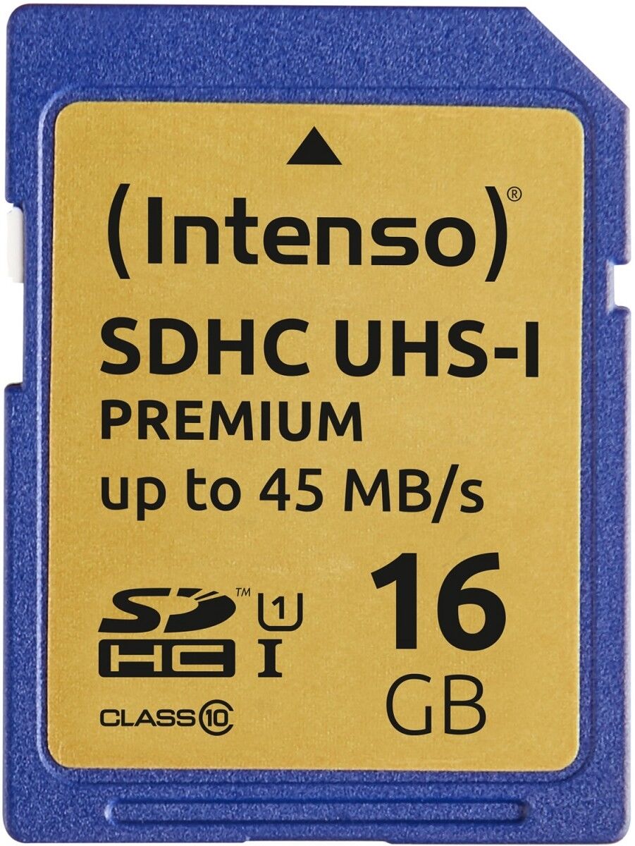 Intenso SD Karte UHS-I Premium. Kapazität: 16 GB, Flash Card Typ: SDHC, Flash-Memory-Klasse: Klasse 10, Interner Speichertyp: UHS-I, Lesegeschwindigkeit: 90 MB/s, UHS Speed Klasse: Class 1 (U1)