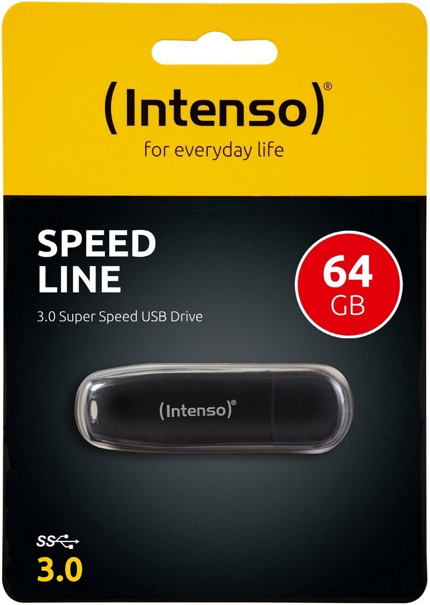 Intenso Speed Line. Kapazität: 64 GB, Geräteschnittstelle: USB Typ-A, USB-Version: 3.2 Gen 1 (3.1 Gen 1), Lesegeschwindigkeit: 70 MB/s. Formfaktor: Kappe. Gewicht: 8 g. Produktfarbe: Schwarz