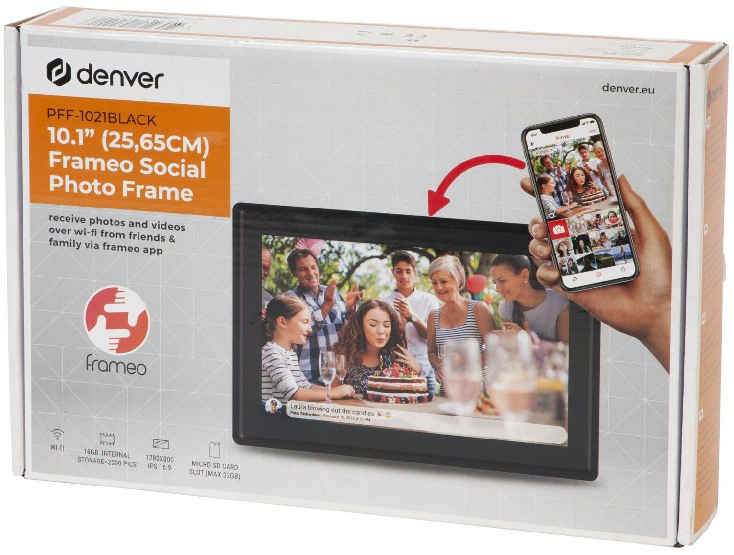 Denver PFF-1021BLACK. Bildschirmdiagonale: 25,6 cm (10.1 Zoll), Bildschirmauflösung: 1280 x 800 Pixel, Anzeige: IPS. Unterstützte Bildformate: JPEG. Interne Speicherkapazität: 16 GB, Kompatible Speicherkarten: MicroSD (TransFlash). USB-Stecker: Mikro-USB. Produktfarbe: Schwarz, Dauer des Timers (max.): 30 min, Dauer des Timers (min.): 10 s