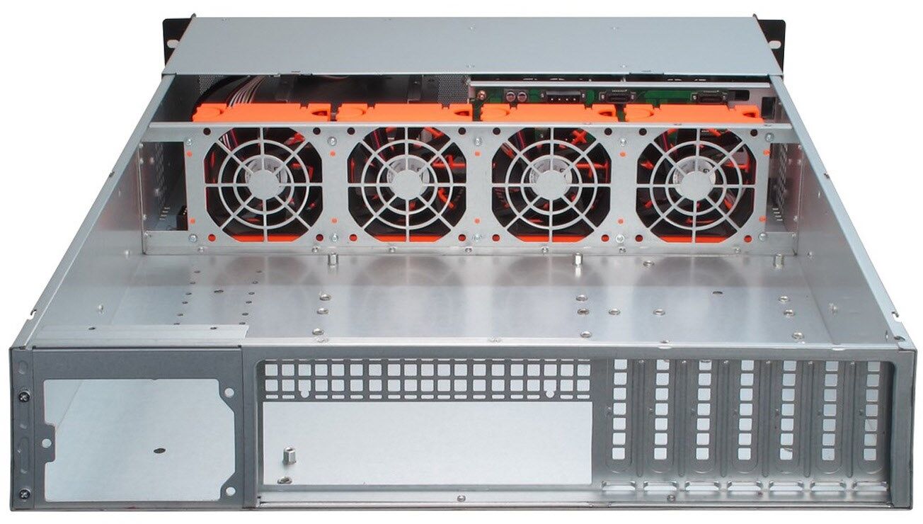 So bietet das 2U 2406 die Möglichkeit maximal sechs 2,5" oder 3,5" Hot-Swap Festplatten sowie ein 5,25" externes Laufwerk sowie eine interne 2,5" Festplatte einzubauen. Im mitgelieferten 5,25" Einbaurahmen können zudem 4x 2,5" oder 1x 3,5" Festplatten verbaut werden, sofern kein 5,25" Laufwerk benötigt wird. Das 2U 2406 ist mit vier serienmäßig eingebauten 80mm Lüfter ausgestattet, welche sich intern direkt hinter den Laufwerkshalterungen befinden, und so zuverlässig für eine optimale Kühlung sorgen.