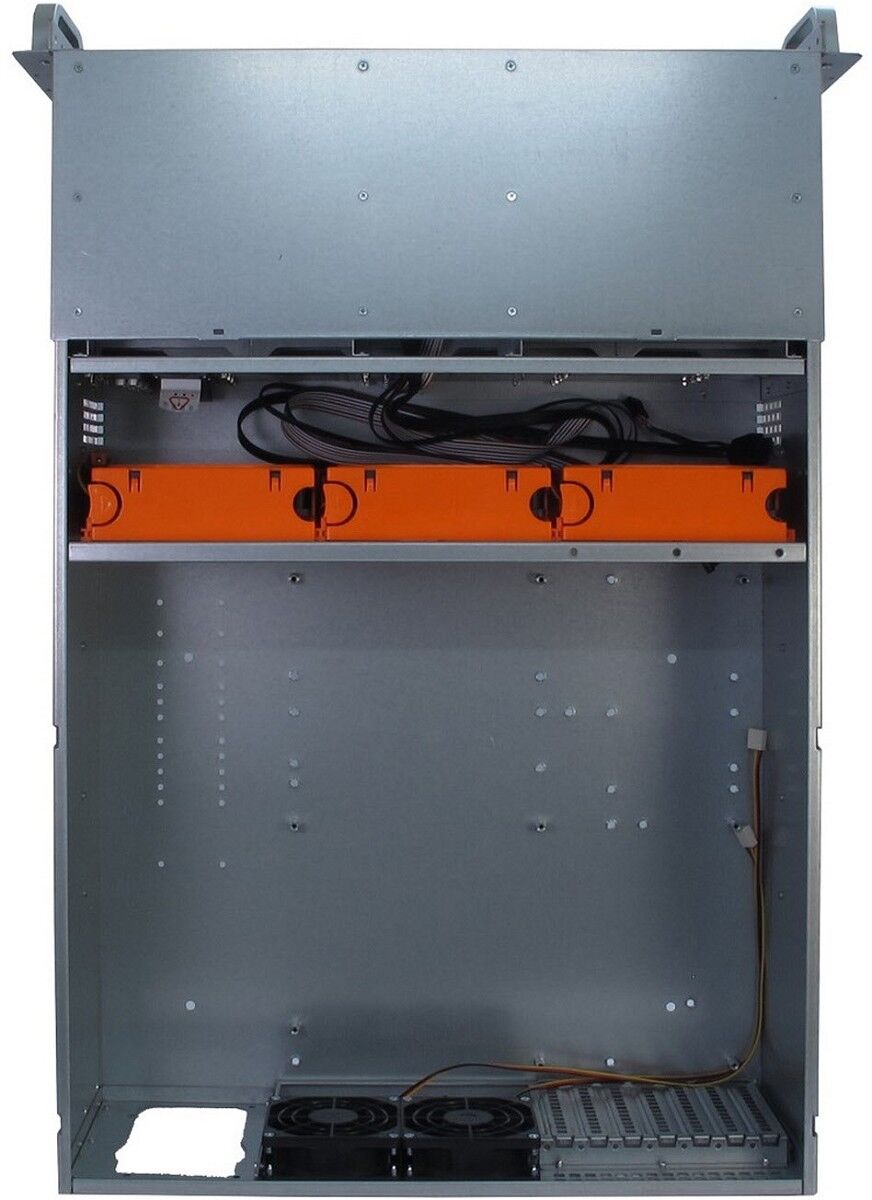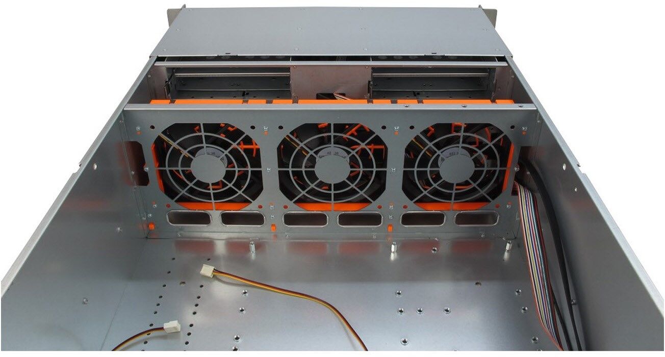 Das 4U 4416 ist mit fünf serienmäßig eingebauten Lüftern ausgestattet, wovon sich drei 120mm Lüfter intern direkt hinter den Laufwerkshalterungen befinden. Zwei weitere 80mm Lüfter an der Rückseite sorgen zudem zuverlässig für eine optimale Kühlung.