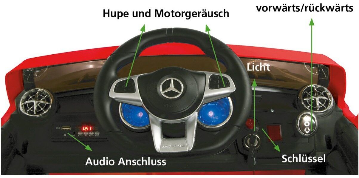 Einsteigen, Zündschlüssel herumdrehen, Licht an und Gas geben, wer hat als Kind nicht davon geträumt. Jetzt kann dieser Traum wahr werden – mit den lizensierten Mercedes-AMG SL 65 Ride-On-Cars von Jamara. Mit originalgetreuem Chassis, Multifunktionslenkrad, beleuchtetem Armaturenbrett und tollen Soundeffekten kommen die kleinen Flitzer daher. Einfach an der Steckdose auftanken und loscruisen. Der leistungsstarke Fahrakku kommt auf über einer Stunde Fahrzeit, bei nur einer „Tankfüllung“. 2 kräftige Antriebsmotoren sorgen unterdessen für genügend Power beim Fahren. Zusätzliches Fahrvergnügen bietet die integrierte Musik und die Möglichkeit über MP3, SD-Karte und USB eigene Tracks laufen lassen zu können. Weitere Besonderheiten der MB SL 65 AMG Ride-on-Cars sind zum einen der Trage- und Ziehgriff an der vorderen Unterseite, mit welchem der Transport zu einem wahren Kinderspiel wird und zum anderen der großräumige Kofferraum in welchem problemlos weitere Spielutensilien transportiert werden können.