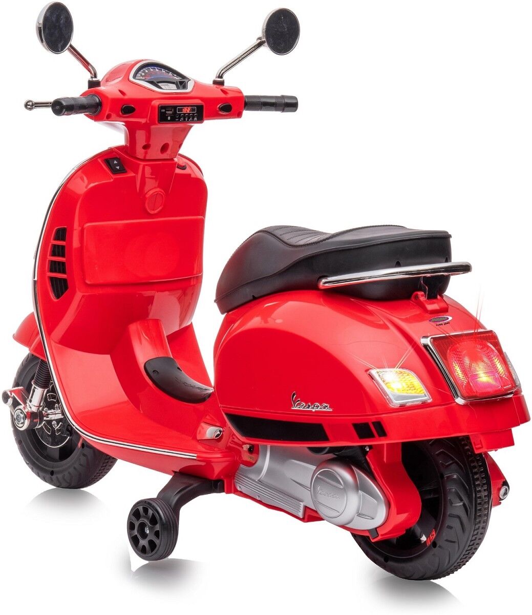 Hier weht unverkennbar das italienische Flair durch die Kinderzimmer! Die Ride-on Vespa GTS 125 bringt das Lebensgefühl des Dolce Vita direkt nach Hause. Dieser kleine Vespa-Roller, der in jeder italienischen Stadt anzutreffen ist, wird bei JAMARA jetzt als lizenziertes Minimotorrad angeboten. Schon die kleinsten Fahrer ab 3 Jahren können mit dem Roller vom Kinderzimmer ins Wohnzimmer düsen. Mit ihrem offiziell lizenzierten Design und den realistischen Details wie dem beleuchteten Armaturenbrett und dem Motorsound beim Start wird jedes Kind das Gefühl haben, auf einem echten Roller zu fahren. Die leistungsstarken Antriebsmotoren und der 12,6V Lithium-Ionen Akku garantieren lange Fahrzeiten und jede Menge Fahrspaß. Der gepolsterte Kunstledersitz sorgt für höchsten Komfort, während die Stützräder sicheren Fahrspaß ermöglichen. Der USB-Anschluss, der Audio Aux-Anschluss und der Micro SD-Slot mit MP3-Funktion bringen zusätzlich Musikspaß auf die Fahrt. Das originalgetreue Design, die Stützräder und die Ultra Grip Gummiringe an den Rädern machen die Vespa zu einem echten Hingucker, während das schlüssellose Starten per Knopfdruck für einfachen Komfort sorgt. Ein perfektes Fahrzeug für kleine Vespa-Fans – und während die Kinder ihren Spaß haben, können sich die Eltern vielleicht eine kleine Auszeit bei einem Espresso gönnen!