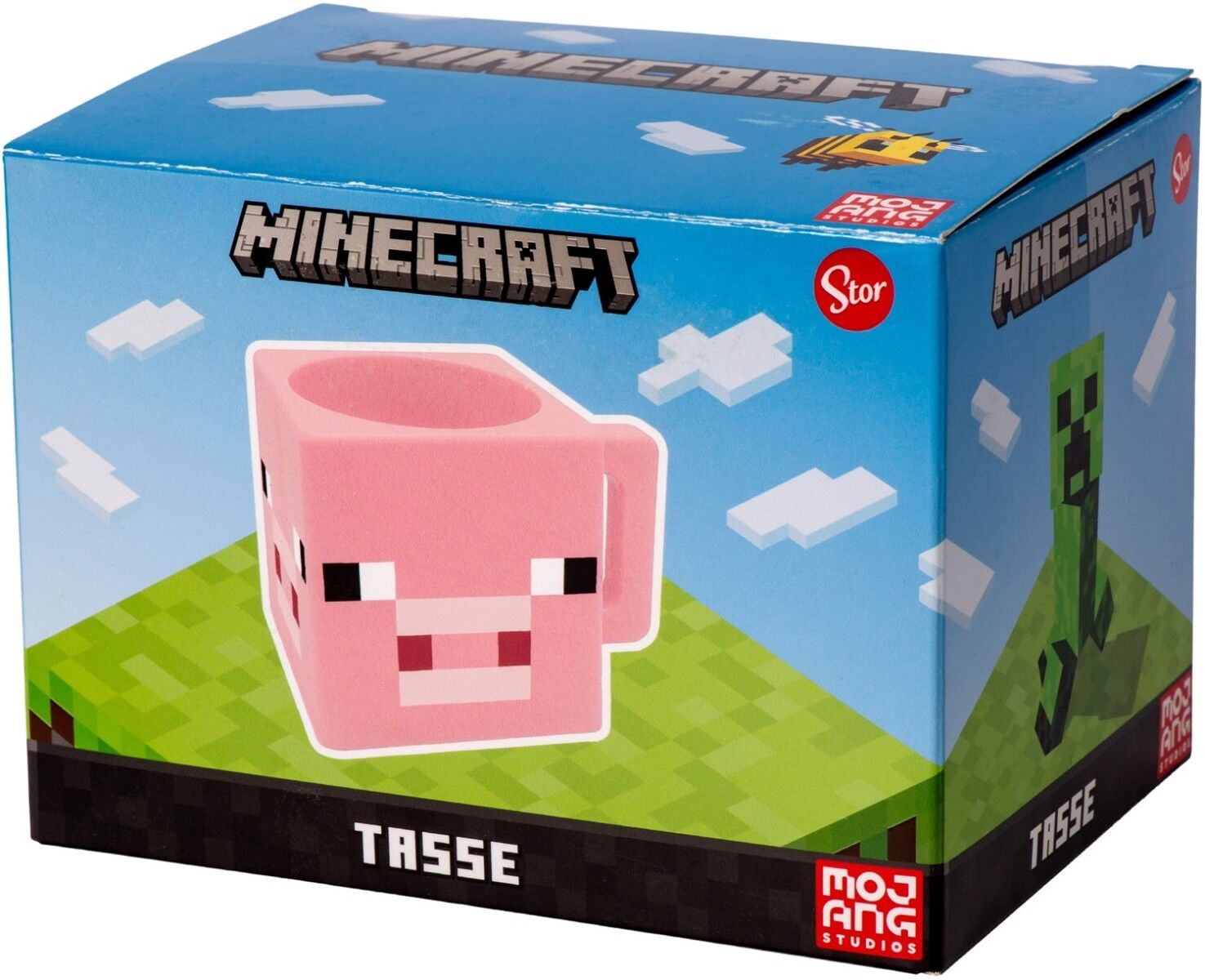 Die mikrowellengeeignete Tasse mit einem Fassungsvermögen von ca. 290 ml, zeichnet sich durch ein Minecraft-typisches Motiv aus – auf drei Seiten der Tasse ist das Gesicht der bekannten Schwein-Kreaturen zu sehen
