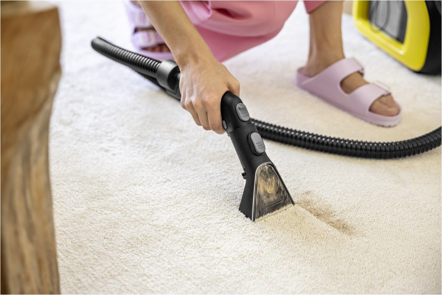 Bewährte Kärcher Technologie für optimale fasertiefe Reinigungsergebnisse: komfortables Waschsaugen mit hochflexiblem Sprühschlauch und ergonomischem Zubehör