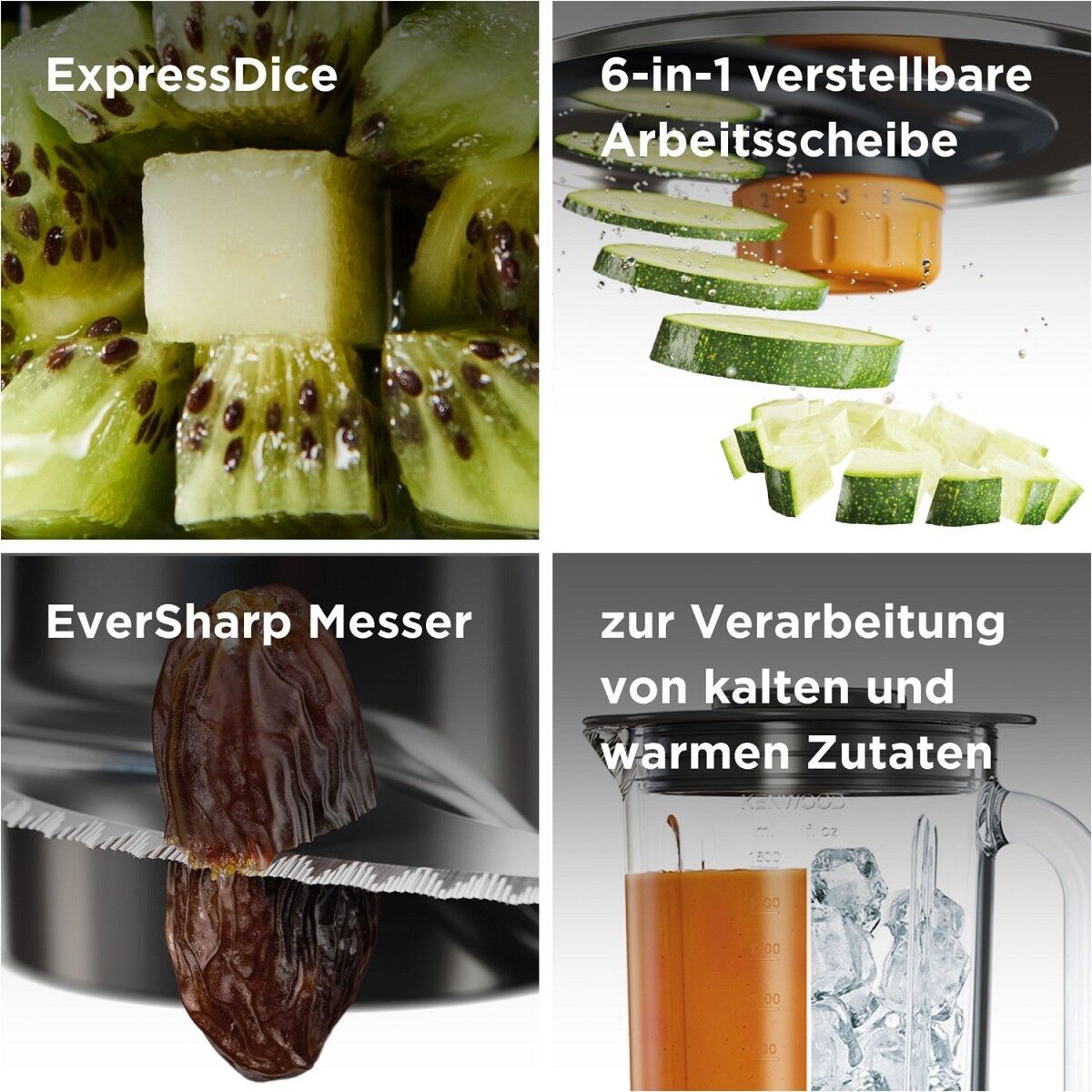 Zubehör: 3 l Arbeitsbehälter, 1,5 l ThermoResist™ Glas Aufsatz, Zitruspresse, EverSharp™ Messer, 6-in-1 verstellbare Arbeitsscheibe und weitere Scheiben, Express Dice™, Doppelschneebesen, Waagschale, Knethaken, SmartStore™ Zubehörtasche, Spatel