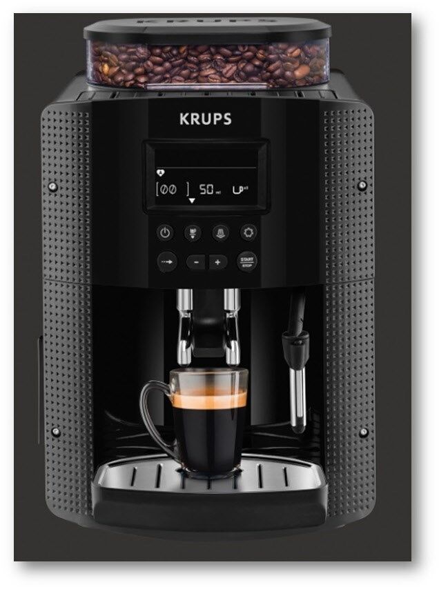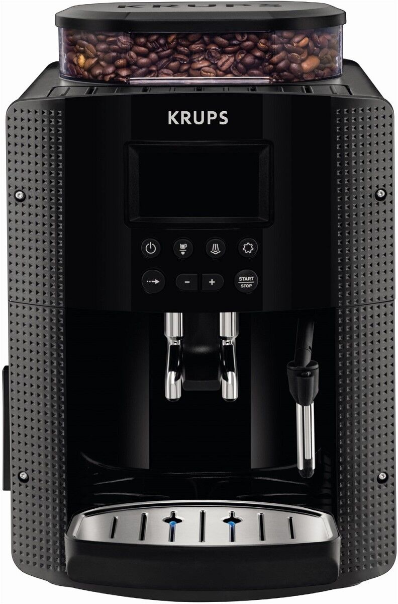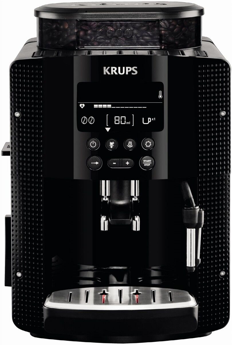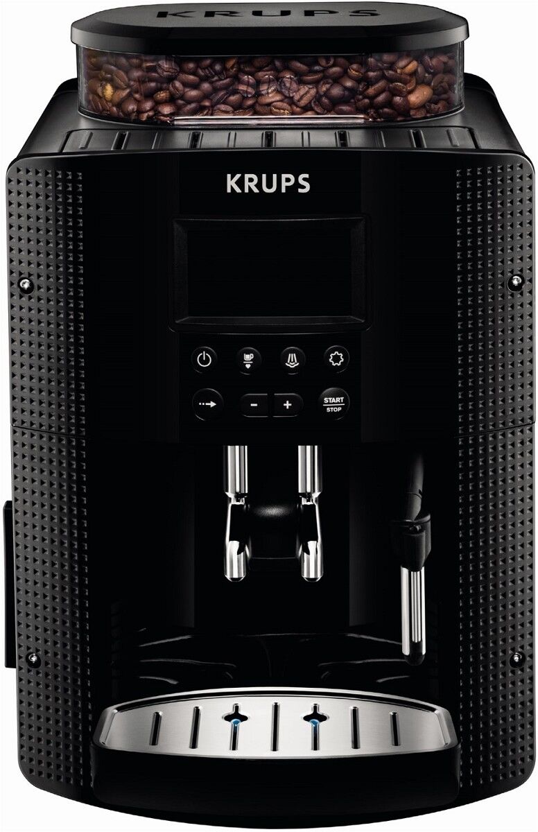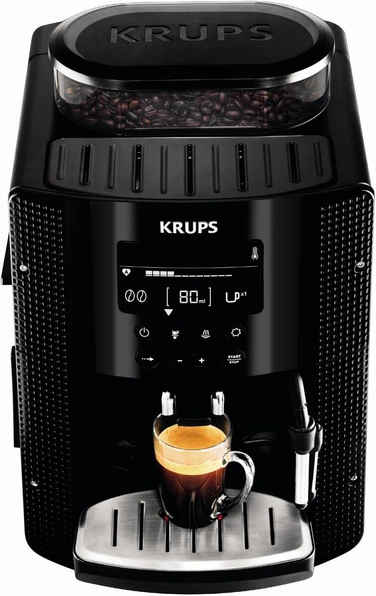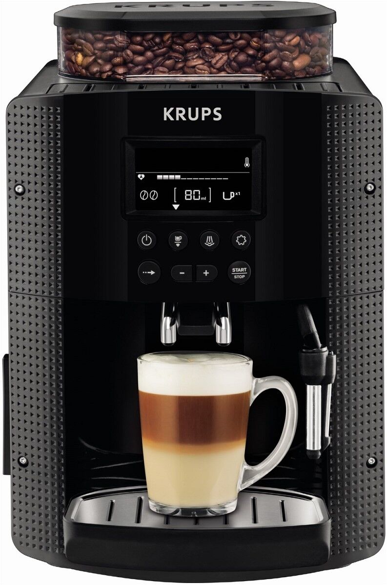 Krups EA8150. Produkttyp: Espressomaschine, Kaffeezubereitungstyp: Vollautomatisch, Fassungsvermögen Wassertank: 1,7 l, Kaffee-Einfüllart: Kaffeebohnen, Gemahlener Kaffee, Behälter für gebrühten Kaffee: Tasse, Kapazität (in Tassen): 2 Tassen, Eingebautes Mahlwerk. Display-Typ: LCD. Leistung: 1450 W. Produktfarbe: Schwarz