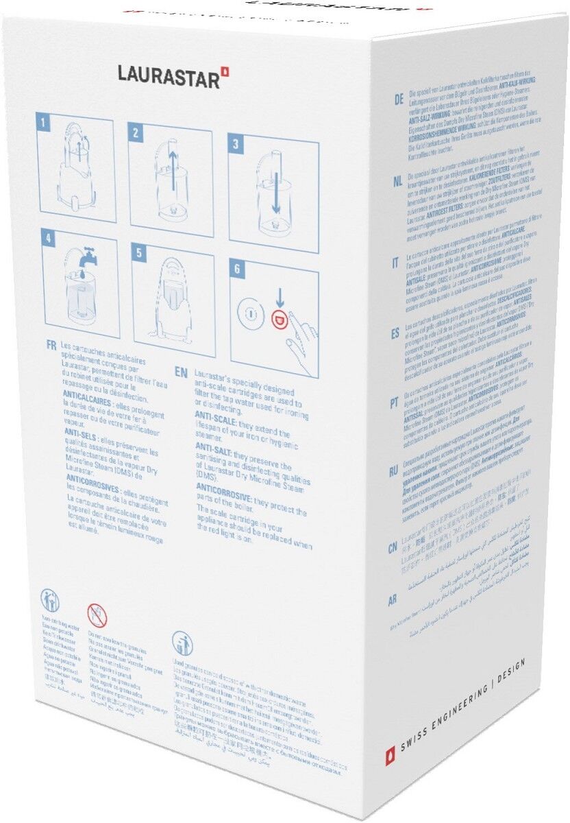 Die Kalkschutzkartusche wurde speziell von den Schweizer Ingenieuren von Laurastar entwickelt und ermöglicht es, Leitungswasser zum Bügeln zu filtern. Dank der Kalkschutzwirkung verlängert sie die Lebensdauer Ihres Bügeleisens. Die Salzschutzwirkung verbessert die Dampfqualität. Durch die Rostschutzwirkung werden die Bestandteile des Dampferzeugers instandgehalten. Die Kalkschutzkartusche muss ausgewechselt werden, wenn das rote Kontrolllämpchen Ihrer Bügelstation blinkt.