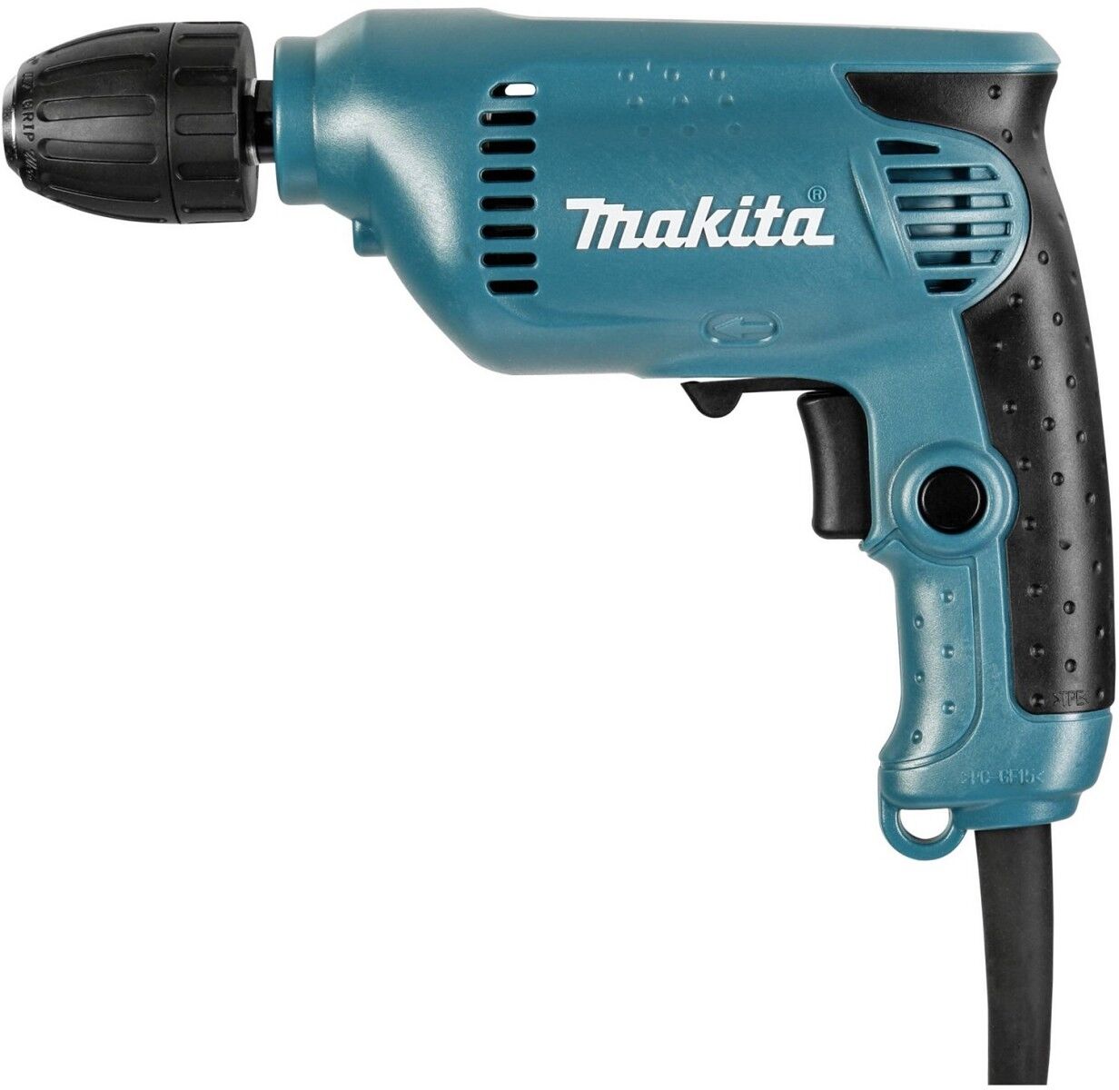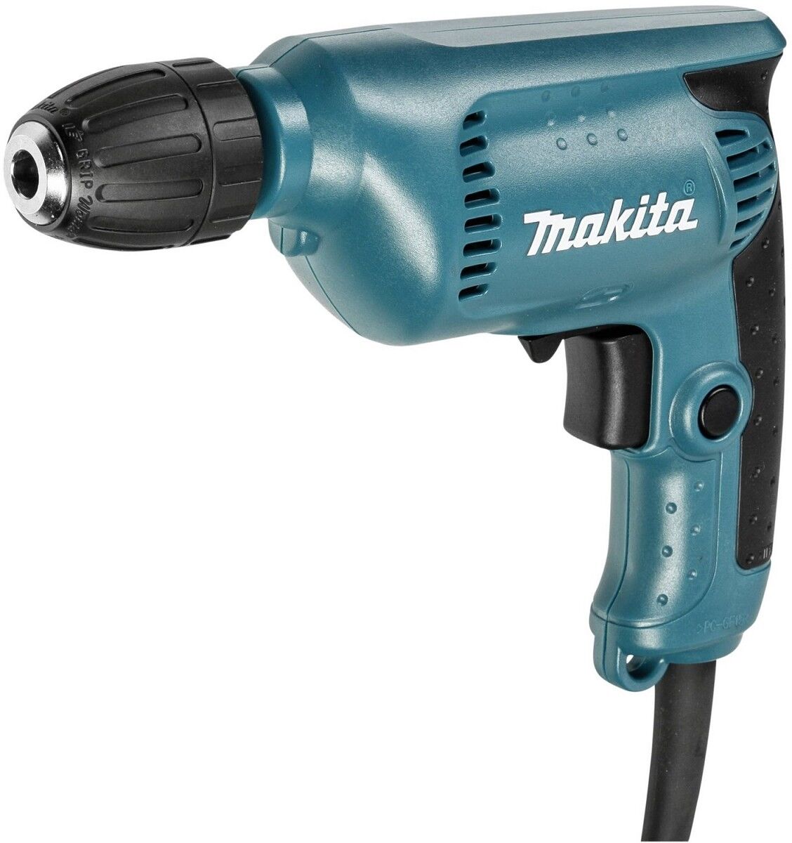 Makita 6413. Spannzange Typ: Ohne Schlüssel. Leerlaufdrehzahl (max.): 3400 RPM, Bohrdurchmesser in Holz (max.): 2,5 cm, Bohrdruchmesser in Stahl (max.): 1 cm. Energiequelle: AC, Eingangsleistung: 450 W, Kabellänge: 2 m. Gewicht: 1,3 kg, Breite: 64 mm, Tiefe: 234 mm