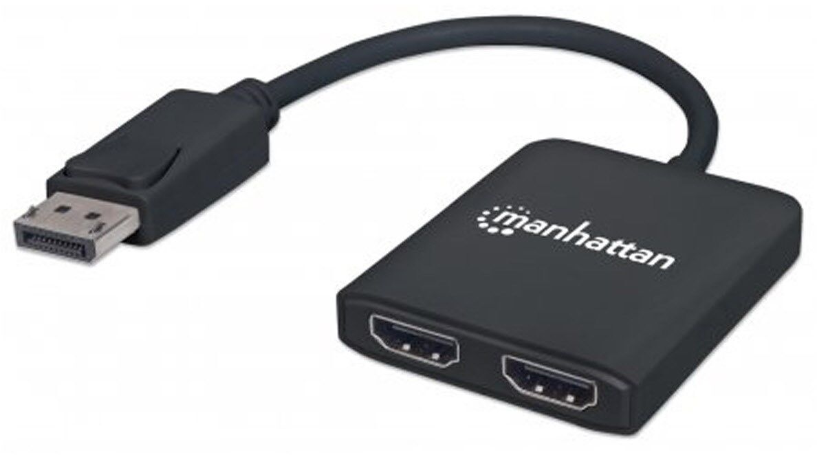 | Manhattan DisplayPort auf 2-Port HDMI MST-Hub, Zum Verteilen eines DisplayPort-Signals auf zwei HDMI-Monitore, Anzeigemodi Gespiegelt, Erweitert und Videowand, 4K@30Hz, Stromversorgung über USB, schwarzz, DisplayPort, 2x HDMI, 3840 x 2160 Pixel, Schwarz, Kunststoff, 1 m | ||||