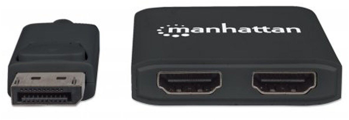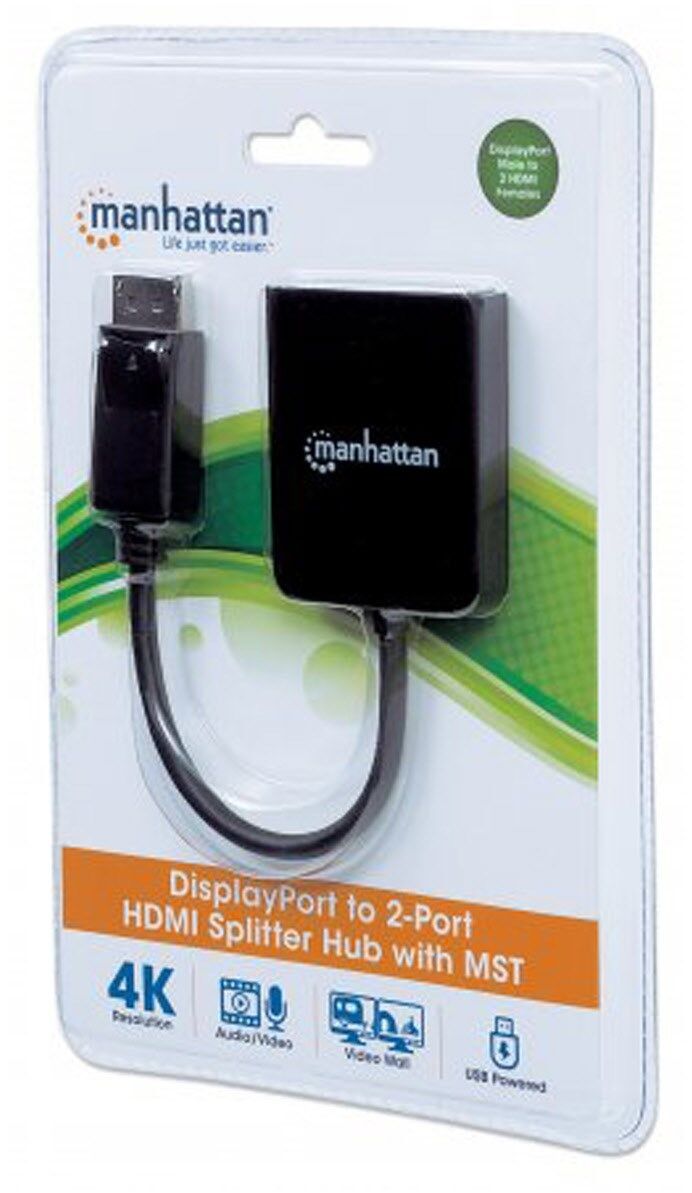 Manhattan DisplayPort auf 2-Port HDMI MST-Hub, Zum Verteilen eines DisplayPort-Signals auf zwei HDMI-Monitore, Anzeigemodi Gespiegelt, Erweitert und Videowand, 4K@30Hz, Stromversorgung über USB, schwarzz. Video Porttyp: DisplayPort, Teilnehmerausgang: 2x HDMI. Maximale Auflösung: 3840 x 2160 Pixel, Produktfarbe: Schwarz, Gehäusematerial: Kunststoff. AC Eingangsspannung: 5 V, Eingangsstrom: 2 A. Breite: 50 mm, Tiefe: 255 mm, Höhe: 11 mm. Mitgelieferte Kabel: Mikro-USB