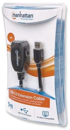 Manhattan SuperSpeed USB 3.0 Repeater Kabel, A-Stecker / A-Buchse, 5 m. Kabellänge: 5 m, Anschluss 1: USB A, Anschluss 2: USB A, USB-Version: USB 3.2 Gen 1 (3.1 Gen 1), Steckerverbindergeschlecht: Männlich/Weiblich, Maximale Datenübertragungsrate: 5000 Mbit/s, Beschichtung Steckerkontakte: Nickel, Produktfarbe: Schwarz, Magnetisch abgeschirmt