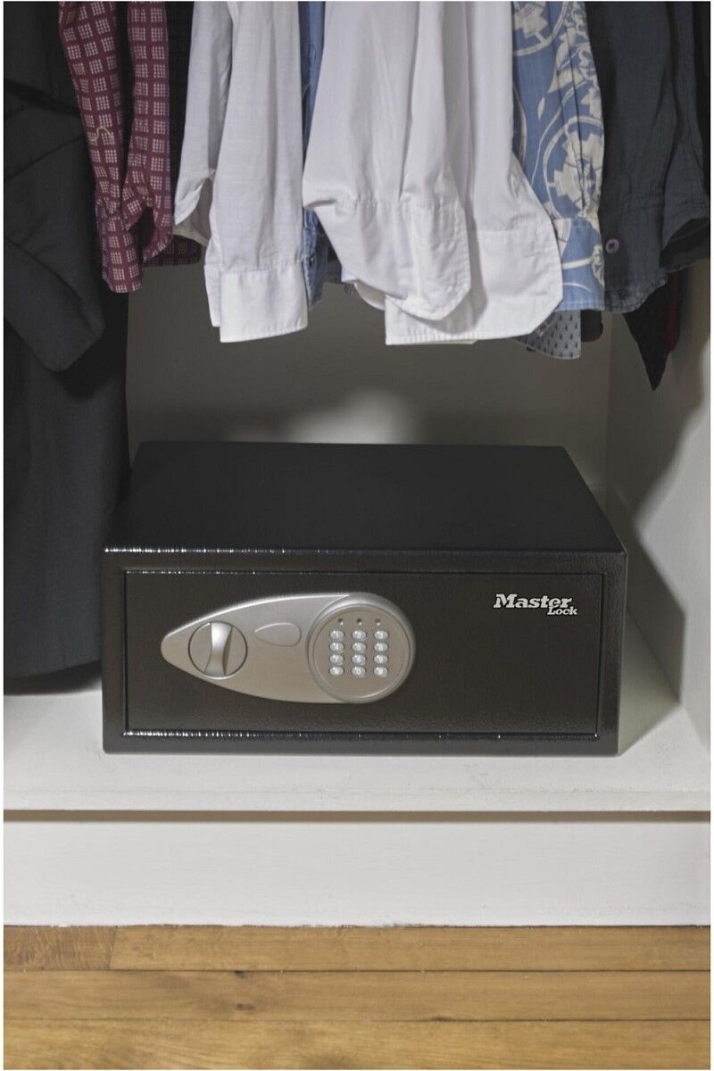 Der mittelgroße Master Lock Safe Nr. X055ML mit Digitalkombination eignet sich ideal zum Schutz von kostbaren Wertgegenständen und Elektronik. Sie können die Kombination für das programmierbare Elektronikschloss selbst wählen und ein übergeordneter Schlüssel stellt sicher, dass Sie Zugang zu Ihrem Safe haben, auch wenn Sie die Kombination vergessen sollten. Der Teppichbelag am Boden schützt den Inhalt vor Kratzern.