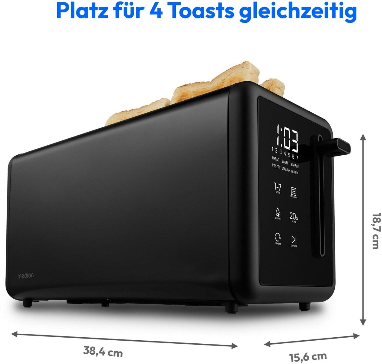 - 2 lange Toastschlitze für bis zu 4 Toasts