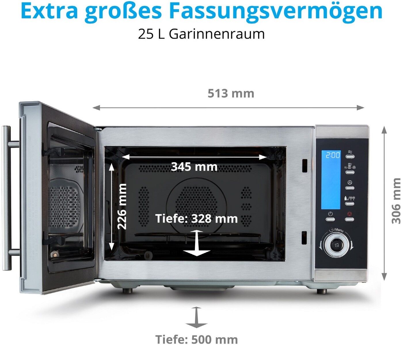 3 Grillfunktionen (Obergrill, Untergrill, Doppelgrill), 4 Kombinationsmöglichkeiten (Mikrowelle &Heißluft), Auftaufunktion