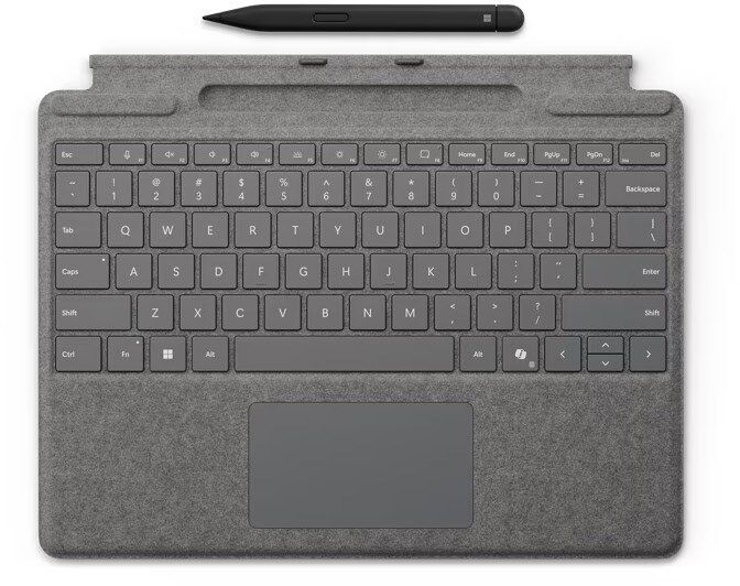 Diese sehr gute Premium-Tastatur mit großem Glas-Touchpad und Copilot-Taste¹ für KI-Leistung auf Knopfdruck, bietet Ihnen Vielseitigkeit auf sehr hohem Niveau. Eine integrierte Surface Slim Pen-Aufbewahrung erlaubt sicheres und einfaches Aufladen.