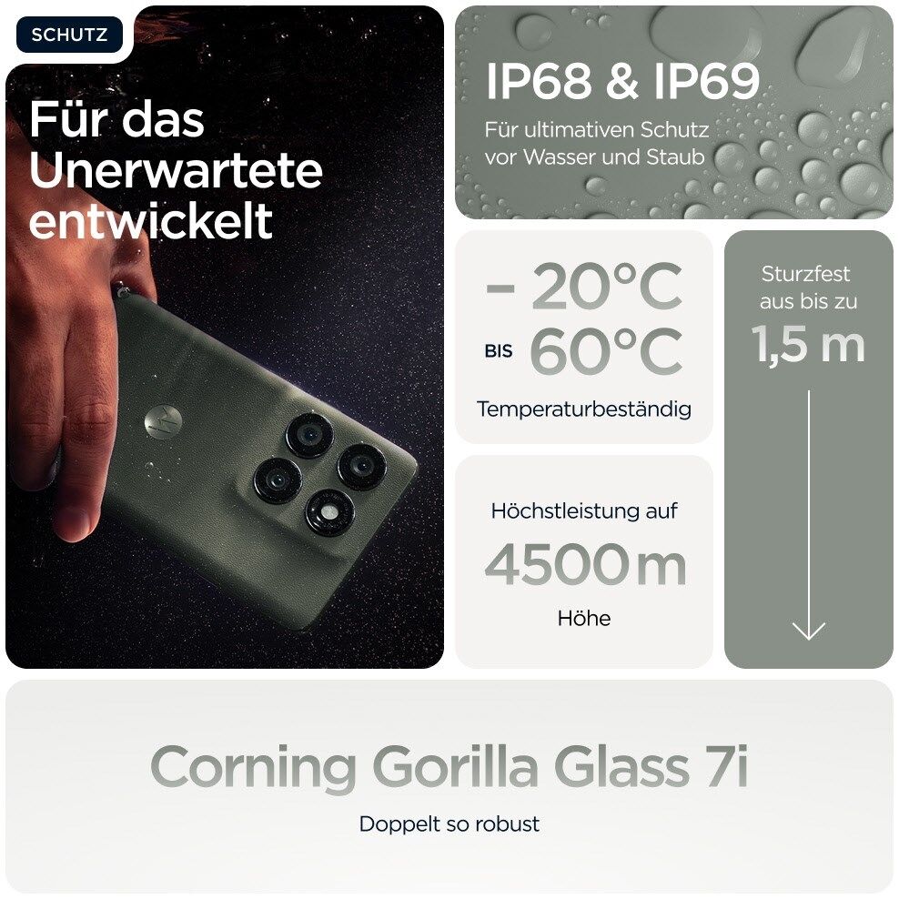 Mit dem motorola edge 60 pro kommst du entspannt durch den Alltag. Dank der IP68- und IP69-Zertifizierung bietet es sehr hohen Schutz vor Staub, Schmutz, Sand und Hochdruckwasser. Außerdem ist es so konzipiert, dass es für bis zu 30 Minuten in bis zu 1,5 Meter tiefes Süßwasser getaucht werden kann - also keine Sorge, wenn es mal ins Wasser fällt⁵.