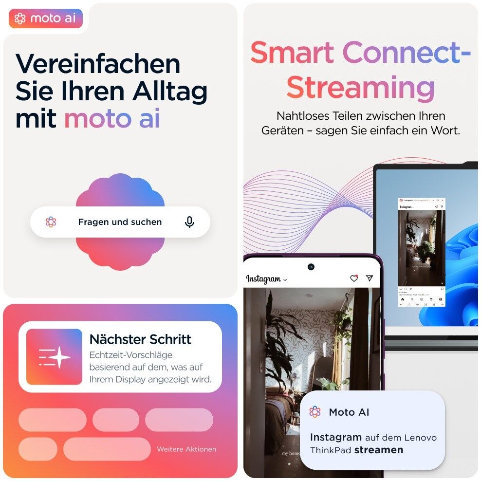 Für den Zugriff auf Moto AI-Features ist eine Anmeldung mit einem Motorola Konto erforderlich. Für die Funktionalität ist eine Internet- oder Mobilfunkverbindung erforderlich.