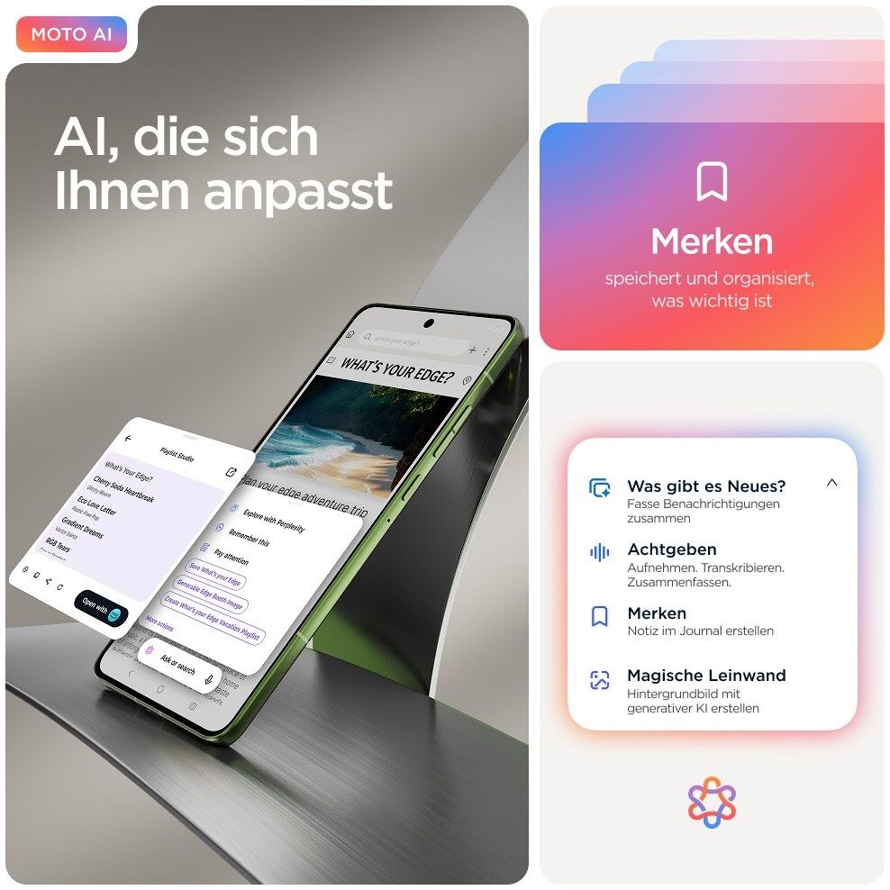 ³ Für den Zugriff auf moto ai-Funktionen ist eine Anmeldung mit einem Motorola-Konto erforderlich. Für die Funktionalität ist eine Internet- oder Mobilfunkverbindung erforderlich. Folgende Sprachen werden unterstützt: Englisch, Spanisch, Portugiesisch, Japanisch, Deutsch, Französisch, Polnisch, Rumänisch, Italienisch.