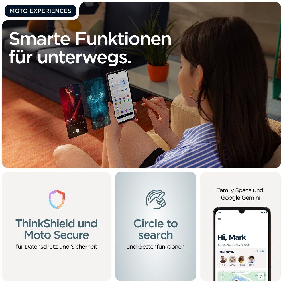 Wir präsentieren das moto g06 – ein Smartphone, das deine Erwartungen weit übertreffen wird. Erwecke deine Lieblingssendungen und -filme zum Leben auf einem riesigen, hellen 6,88" Display, unserem bisher größten auf dem moto g, mit Stereo-Lautsprechern und Dolby Atmos®-Sound. Mit dem AI-basierten 50-MP-Kamerasystem³ machst du atemberaubende Fotos bei jedem Licht. Supereffizientes Multitasking mit bis zu 12 GB RAM mit RAM-Boost¹ ². Alles ganz entspannt dank erweiterter Funktionen für eine längere Lebensdauer und Premiumdesign, darunter IP64-Wasserschutz⁴, Corning® Gorilla® Glass 3 und lederinspiriertem Finish. Mit einmal Laden bist du 2 Tage dabei⁵ ⁶. Und exklusive Moto-Funktionen machen dein Smartphone sicherer, individueller und unterhaltsamer. Mit Circle-to-Search kannst du sofort alles auf deinem Smartphone suchen. Hol dir mehr mit dem moto g06.