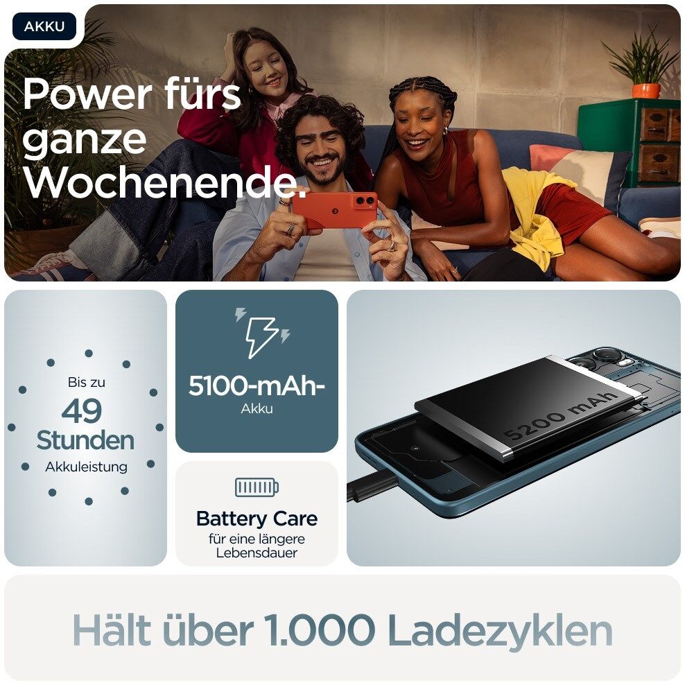 ⁵ Alle Angaben zur Akkulaufzeit sind Annäherungswerte, die auf einem durchschnittlichen gemischten Benutzerprofil basieren, das sowohl Nutzungs- als auch Standby-Zeiten unter optimalen Netzbedingungen berücksichtigt. Die tatsächliche Akkuleistung hängt von verschiedenen Faktoren ab, z. B. der Signalstärke, den Netzwerk- und Geräteeinstellungen, der Temperatur, dem Zustand des Akkus sowie dem Nutzungsverhalten, und kann daher von den Angaben abweichen.