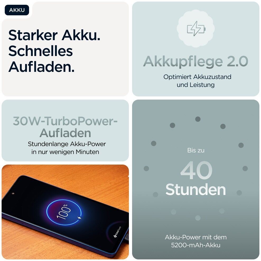 Alle Angaben zur Akkuleistung sind Annäherungswerte, die auf einem durchschnittlichen gemischten Benutzerprofil basieren, das sowohl Nutzungs- als auch Standby-Zeiten unter optimalen Netzbedingungen berücksichtigt. Die tatsächliche Akkuleistung hängt von verschiedenen Faktoren ab, z. B. der Signalstärke, den Netzwerk- und Geräteeinstellungen, der Temperatur, dem Zustand des Akkus und dem Anwendungsverhalten, und kann daher von den Angaben abweichen.