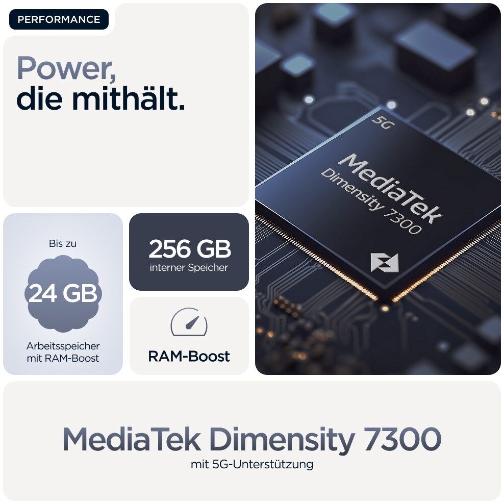 Der schnelle und effiziente MediaTek Dimensity 7300-Prozessor bietet dir die nötige Performance, um ultraschnelle 5G-Netzwerke optimal zu nutzen. Streame Inhalte unterwegs, spiele Cloud-basierte Spiele und lade deine Lieblingssendungen in Sekundenschnelle herunter.¹⁰