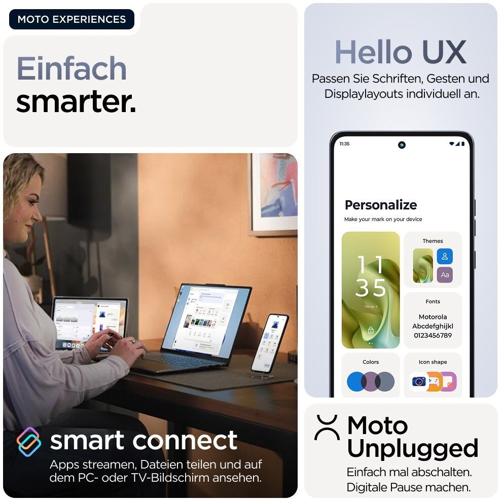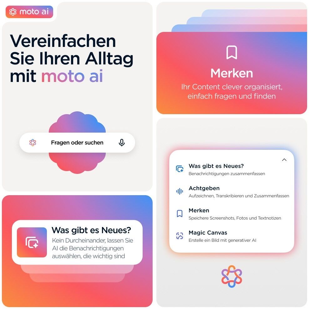 Für den Zugriff auf Moto AI-Features ist eine Anmeldung mit einem Motorola Konto erforderlich. Für die Funktionalität ist eine Internet- oder Mobilfunkverbindung erforderlich.