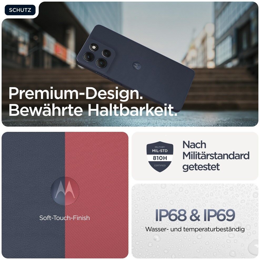 Das moto g86 5G ist ebenso schön wie widerstandsfähig – und damit wie gemacht für die Abenteuer des Alltags. Das ultradünne, leichte Design in einer speziell ausgewählten Farbe von Pantone™ hebt dich von der Masse ab. Das weiche Soft-Touch-Finish verleiht dem Smartphone einen Hauch von Luxus und unterstreicht deinen Style. Gleichzeitig bietet das moto g86 5G umfassenden Schutz: mit IP68/IP69-zertifiziertem Wasserschutz⁴ und widerstandsfähigem Corning® Gorilla® Glass 7i.