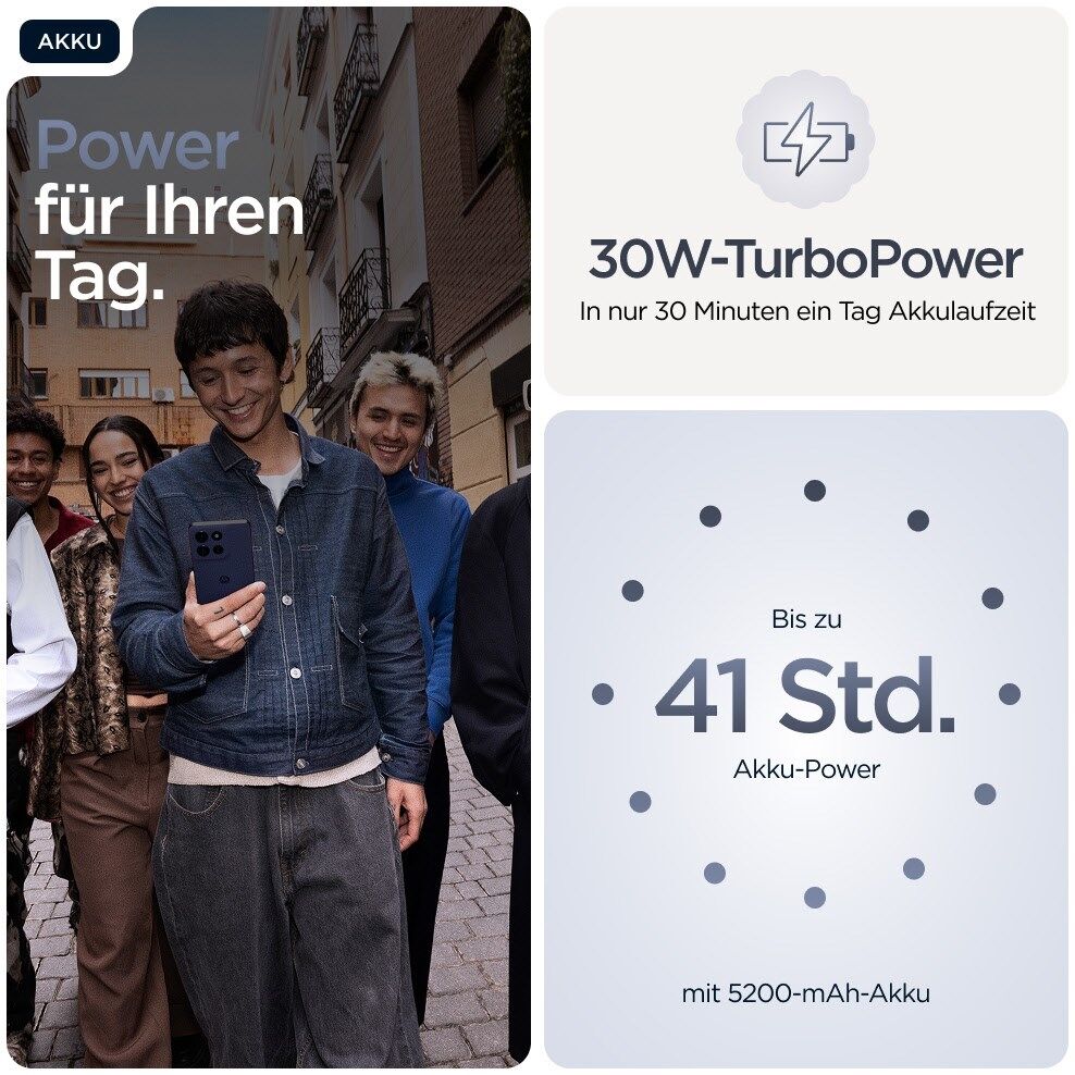 Motorola 30W-TurboPower™-Ladegerät erforderlich; separat erhältlich. Maximale 30W-Ladegeschwindigkeit mit 68W-TurboPower™ auf dem Gerät; Ladegeräte mit höherer Leistung erhöhen die maximale Ladeleistung nicht. Durchschnittsnutzer können in 30 Minuten Aufladen bis zu 20 Stunden Akkulaufzeit erhalten. Der Akku muss möglichst stark entladen sein. Der Lade-Boost muss aktiviert sein. Der Ladevorgang verlangsamt sich mit steigendem Ladezustand.