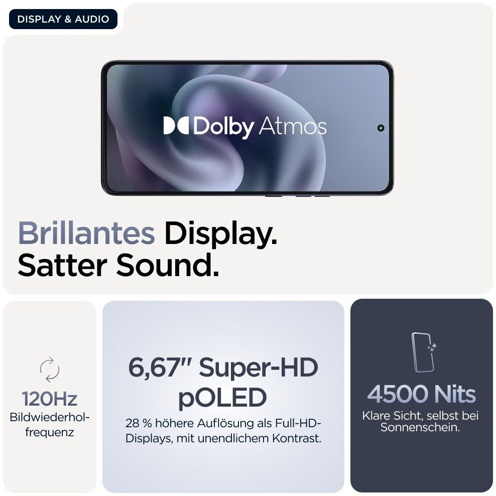Verpasse nichts bei deinen Lieblingsfilmen, Serien und Spielen. Erwecke jedes Detail auf dem ultrahellen 6,67"-Super-HD-Display zum Leben. Erlebe auf dem nahezu randlosen Display alles im Großformat – kontrastreich und mit Milliarden von Farben. Selbst bei strahlendem Sonnenschein. Genieße dein Entertainment flüssig und verzögerungsfrei dank der blitzschnellen Bildwiederholfrequenz von 120 Hz.⁸ Und höre den Rundum-Sound über die Stereo-Lautsprecher mit Dolby Atmos®.