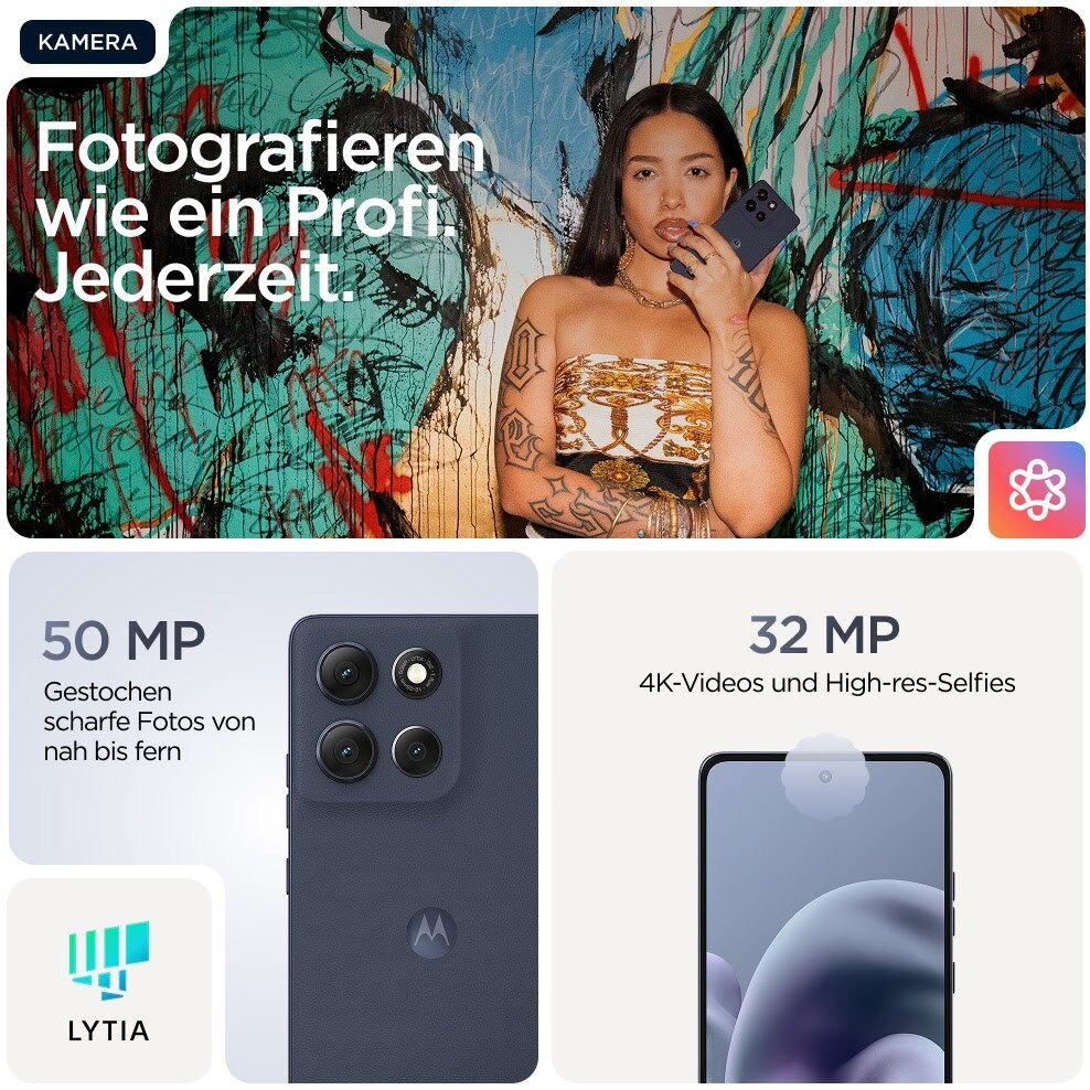 Geh bis ans Limit mit dem moto g86 5G! Aus hochwertigen Materialien gefertigt, überzeugt es mit einem markanten Design und fortschrittlichem Schutz vor Wasser und Stürzen.³ ⁴ Genieße alles auf dem ultrahellen 6,67"-Super-HD-Display (1220p) mit Sound von Dolby Atmos®. Mit der 50-MP-Sony LYTIA™ 600-Kamera gelingen dir dank Moto AI⁵ atemberaubende Fotos wie vom Profi. Erhalte über 41 Stunden Akkulaufzeit mit nur wenigen Minuten TurboPower™-Aufladen.⁶ ⁷ Spüre die Power des fortschrittlichen Prozessors, 8 GB RAM und 256 GB Speicherplatz². Und erlebe kreative Freiheit, mühelose Bedienung und einfach ein gutes Gefühl mit exklusiven Moto Experiences. Bereit für jedes Abenteuer: das moto g86 5G.