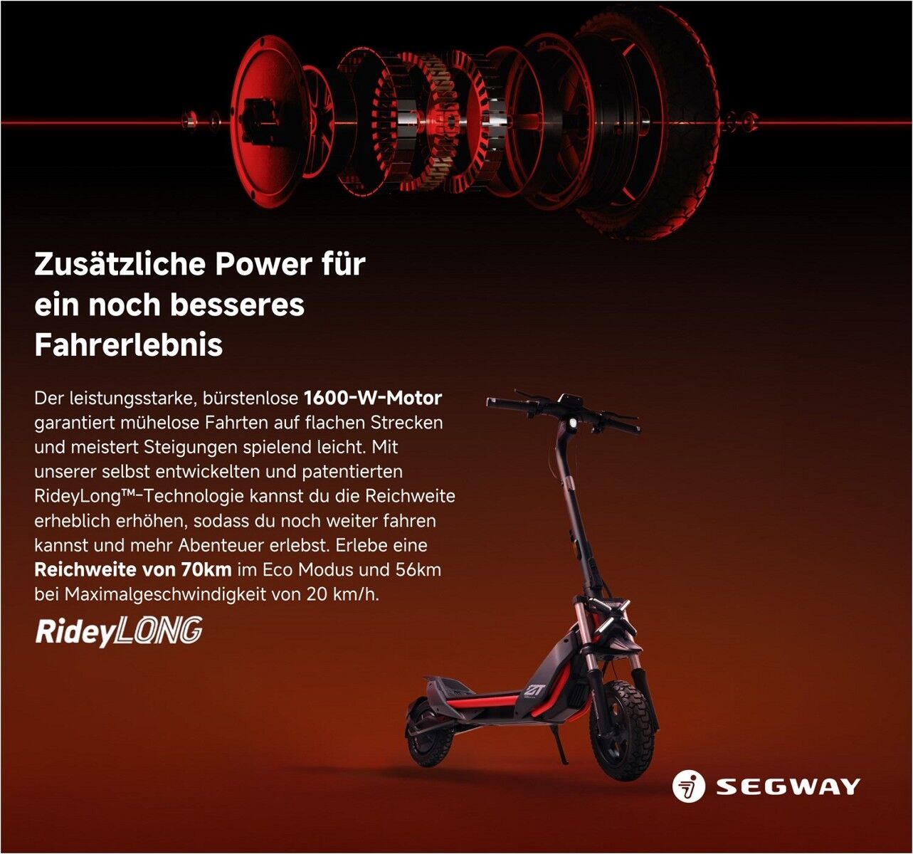 Ausgestattet mit einem 1600-Watt bürstenlosen Motor bietet der ZT3 Pro D kraftvolle Beschleunigung und bewältigt Steigungen von bis zu 25 % mühelos. Die maximale Geschwindigkeit beträgt 20 km/h, ideal für den Stadtverkehr. Dank der innovativen RideyLong™-Technologie und der 597-Wh-Batterie erreichst du eine theoretische Reichweite von bis zu 70 km, bei voller Geschwindigkeit sind es immer noch beeindruckende 56 km – perfekt für lange Fahrten ohne ständiges Nachladen.