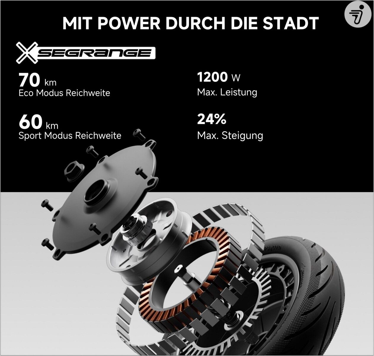 Erstklassige Reichweite – Bis zu 70 km im Eco-Modus und 60 km bei 20 km/h mit einer Steigfähigkeit von bis zu 24 % ist er perfekt für den täglichen Weg zur Arbeit oder lange Fahrten in der Stadt – ohne ständiges Nachladen
