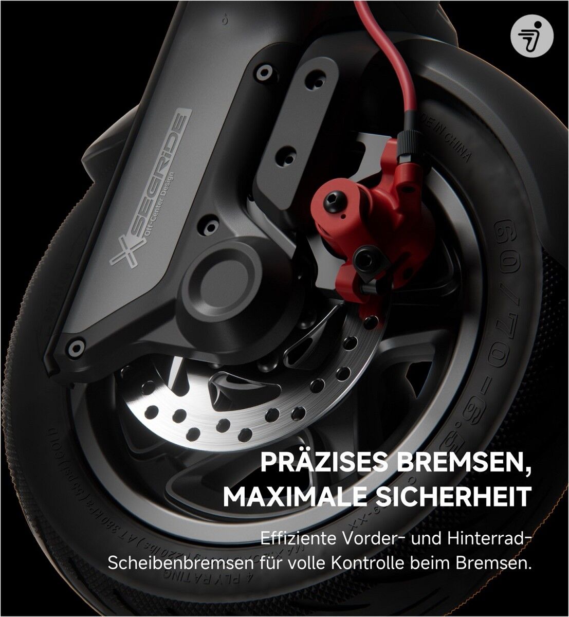 Für eine sanfte und stabile Fahrt ist der eKickScooter mit wartungsfreien, selbstversiegelnden 10-Zoll-Luftreifen sowie einer vorderen hydraulischen Federung und hinteren Elastomer-Federung ausgestattet, die Stöße auf unebenem Terrain absorbieren. Der Ninebot F3 Pro D verfügt außerdem über Scheibenbremsen vorne und hinten, sowie das SegRide™-Stabilitätsverstärkungssystem und das Traktionskontrollsystem (TCS) für optimalen Grip und maximale Kontrolle auf der Straße. Das integrierte 6-Watt-LED-Frontlicht mit Blinkern vorne und hinten sowie Bremsleuchten sorgt für maximale Sicherheit bei jeder Fahrsituation.