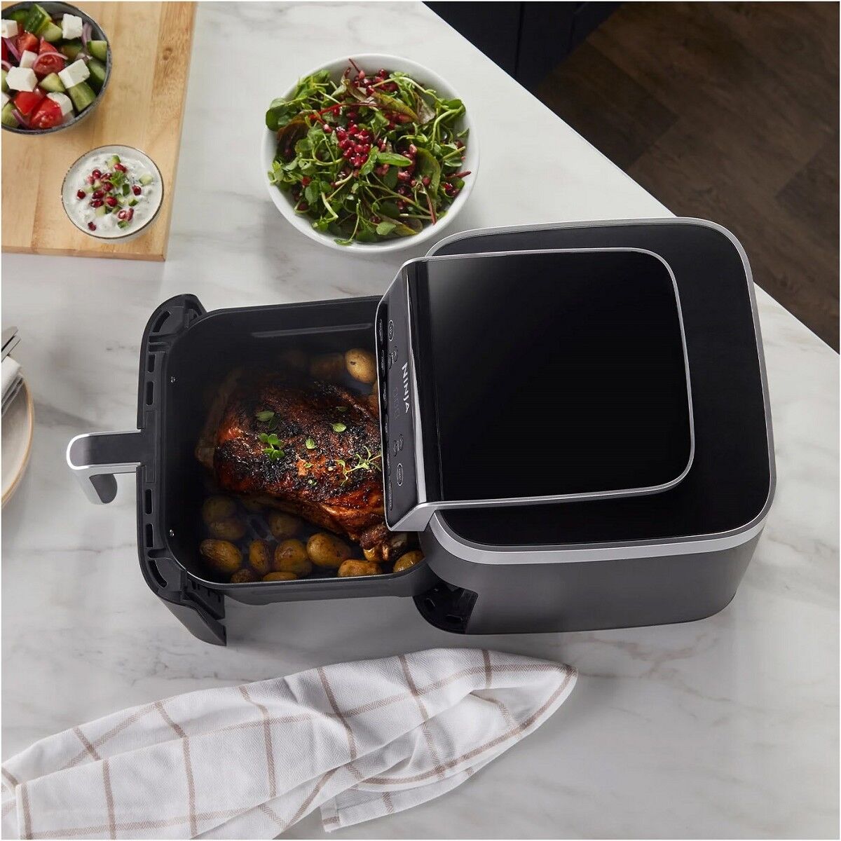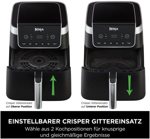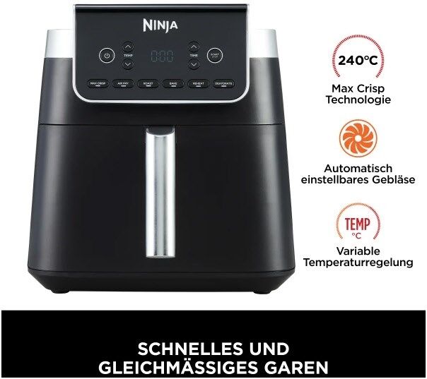 Da sie bis zu 50% schneller gart als ein Umluftofen***, können Sie schnelle, köstliche und gesunde Mahlzeiten in nur wenigen Minuten auf den Tisch bringen. Ganz gleich, ob Sie für Ihre Familie kochen, auf ein geringes Budget achten, gesundheitsbewusste Entscheidungen treffen möchten oder zum ersten Mal eine Wohnung einrichten, mit dieser Ninja Heißluftfritteuse können Sie ganz einfach köstliche Gerichte zubereiten und dabei Zeit, Energie und Mühe sparen.