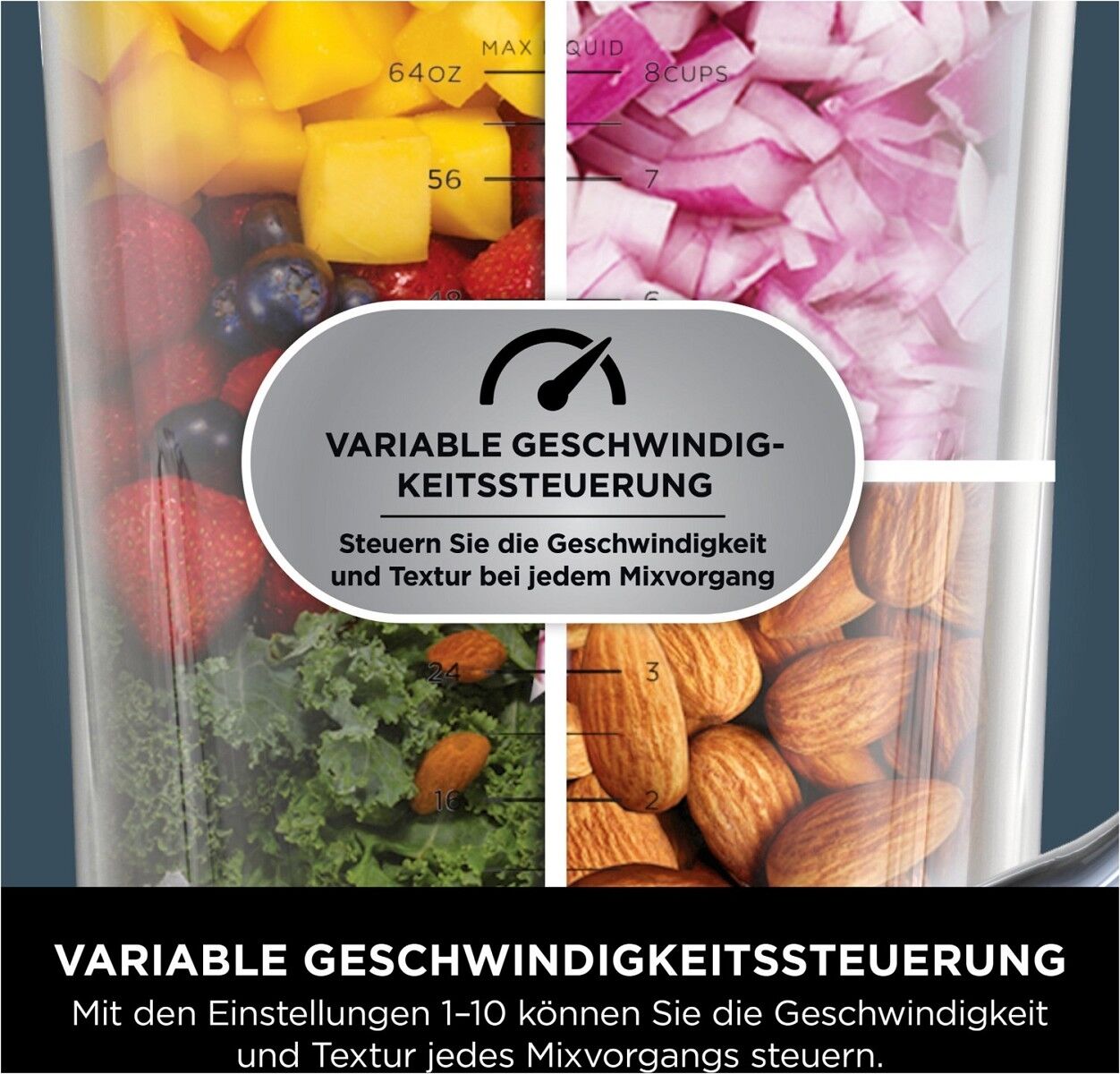 10 manuelle Mixgeschwindigkeiten helfen Ihnen beim schnellen Mixen, Pürieren und Emulgieren von Zutaten. Alternativ lässt sich die Pulse-Einstellung verwenden, um den Zutaten einen kurzen Boost zu geben und die Konsistenz besser zu kontrollieren.