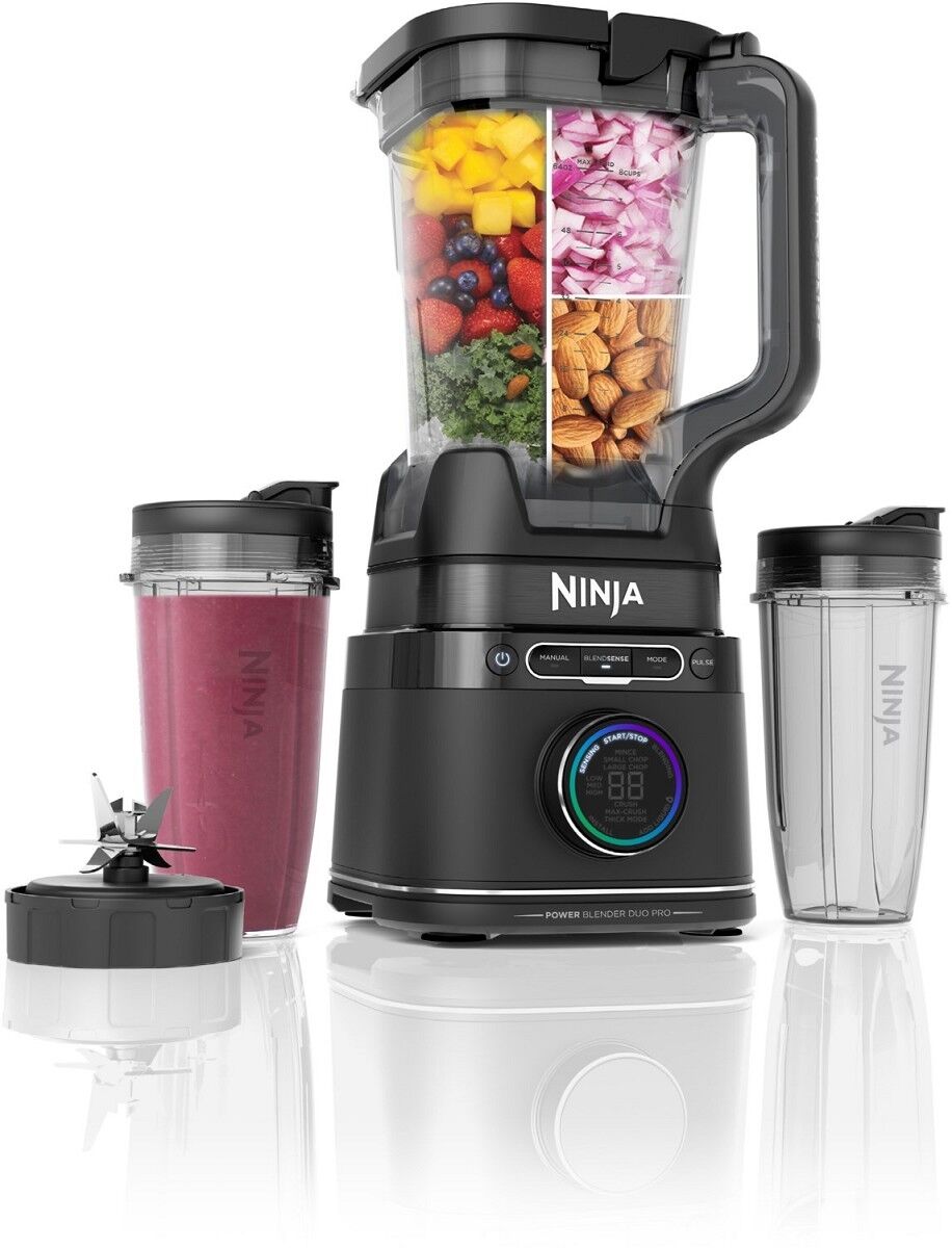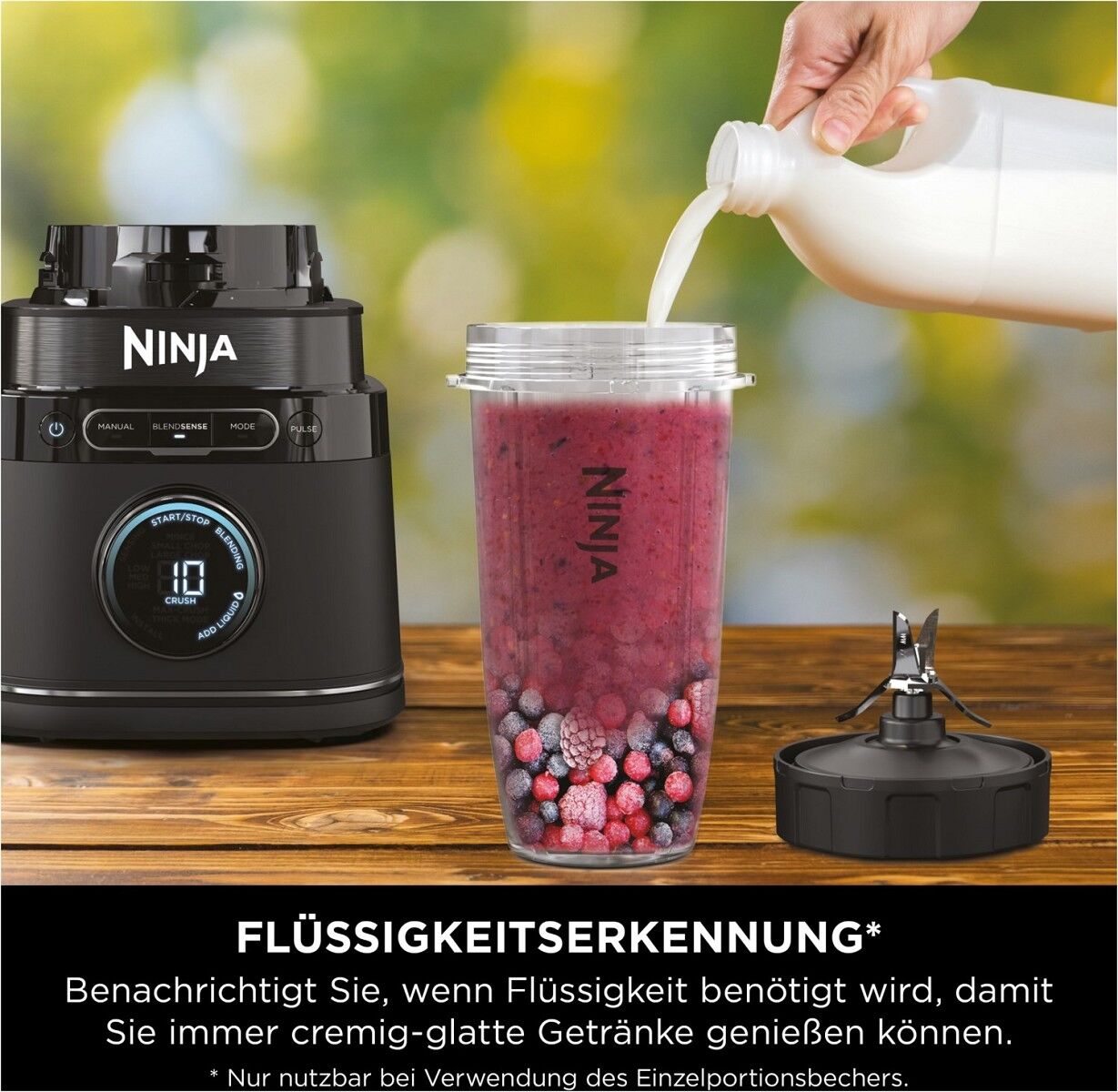 Im Lieferumfang enthalten: 1200 W Motorbasis, Gefäß (2,1 l**), 2 Becher für eine Portion (700 ml***), Ninja Detect Total Crushing und Schneidklinge, Hybrid Edge Klingen, Rezeptheft für Inspiration.